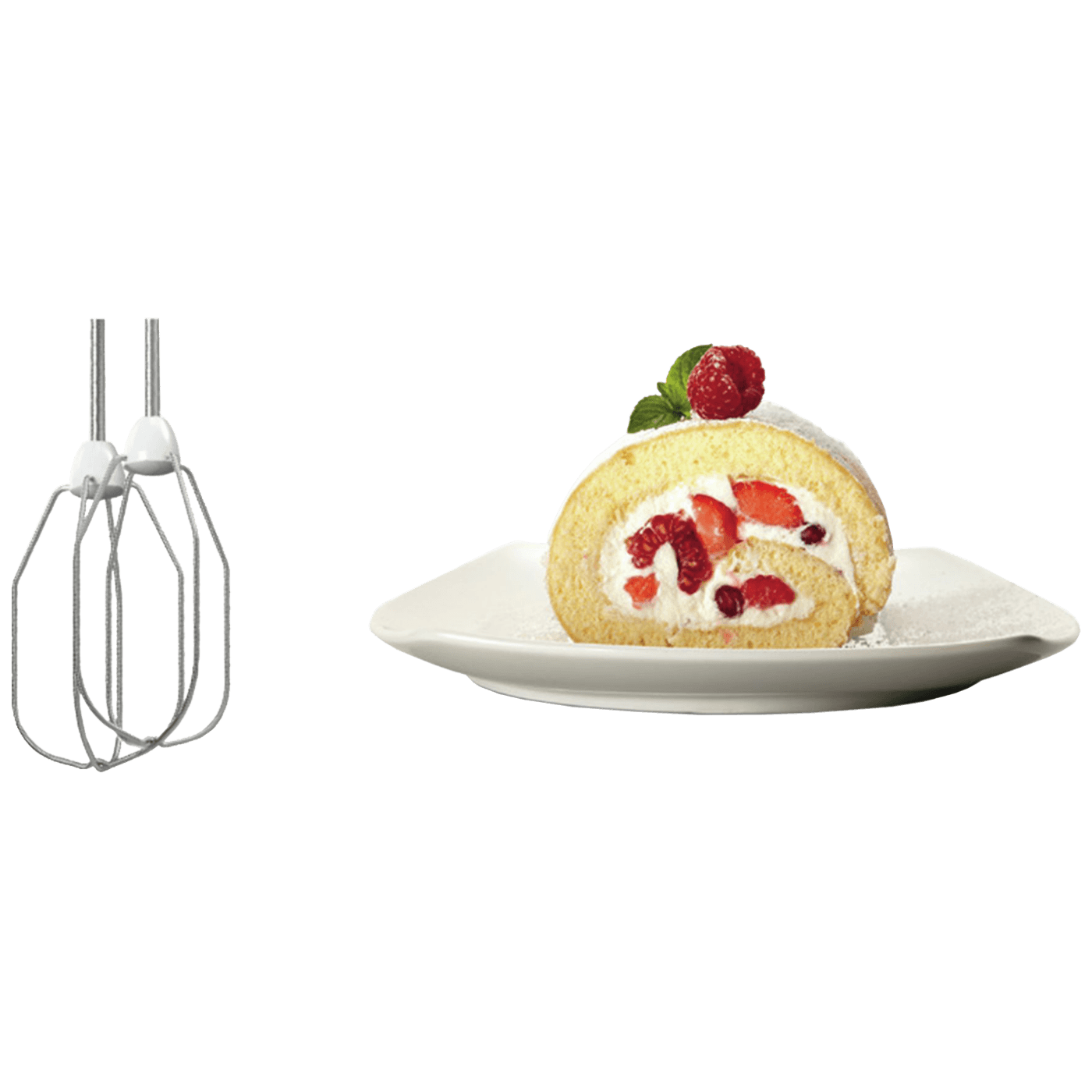 Ručni mikser, snaga motora 375 W, tih, ali snažan motor bez poteškoća tuče vrhnje i gnječi tijesto do savršenstva, 4 radnih brzina + turbo, ergonomski oblikovano kućište za rukovanje bez napora, prikladno za dešnjake i ljevake, ručni mikser i dodatni pribor jednostavno se čiste. Sav dodatni pribor, metlice za miješanje i tučenje, mogu se prati u perilici posuđa, odvojena tipka za izbacivanje metlica, 2 standardne metlice za miješanje, 2 kuke za miješanje od nehrđajućeg čelika