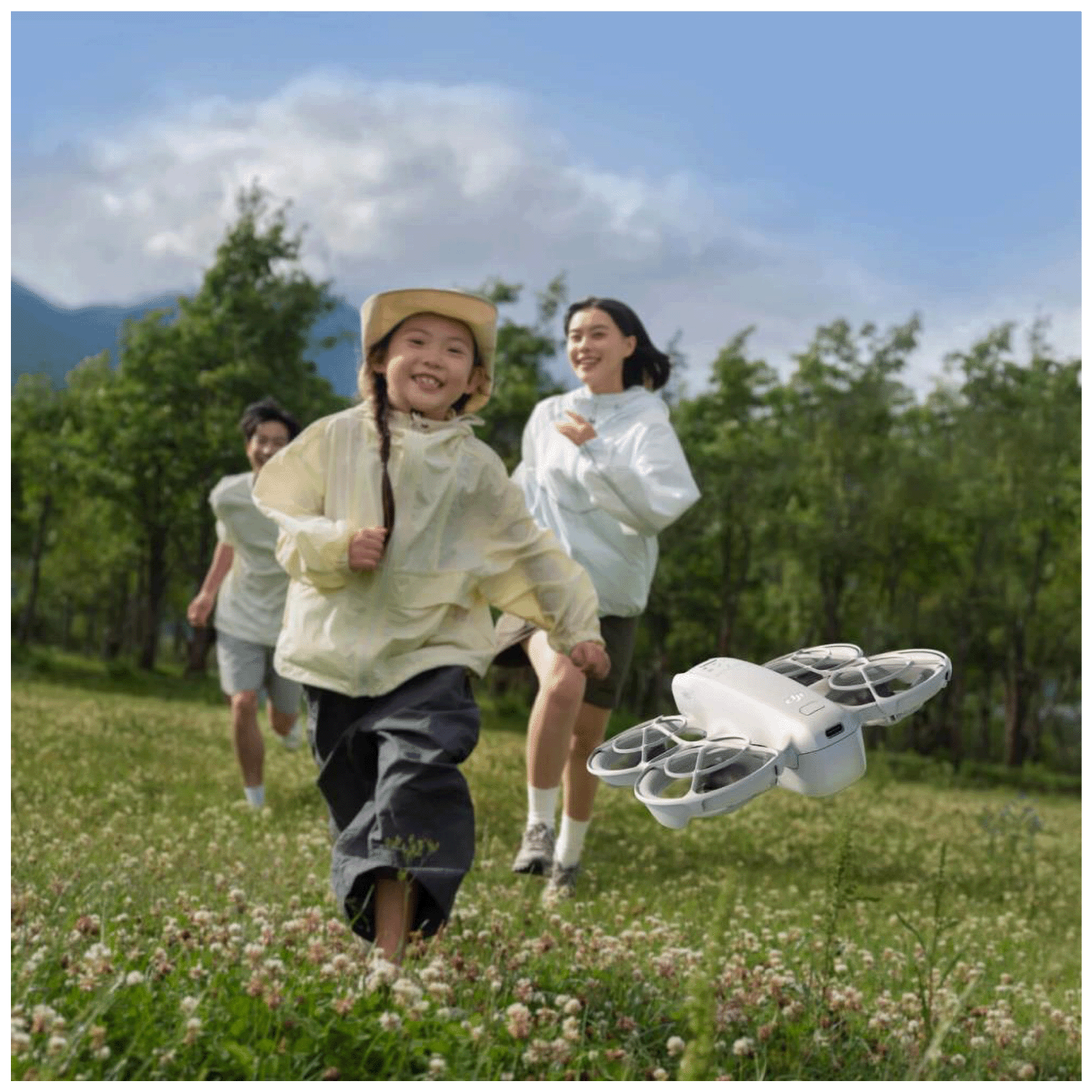 DJI Neo Motion dolazi u izuzetno laganoj izvedbi — težina sa baterijom je otprilike 135 g — što omogućava jednostavno nošenje i brzo pokretanje u rad. Propeleri su zaštićeni poklopcem (“full-coverage propeller guards”) koji dodatno štiti dron i okolinu od slučajnih udara.