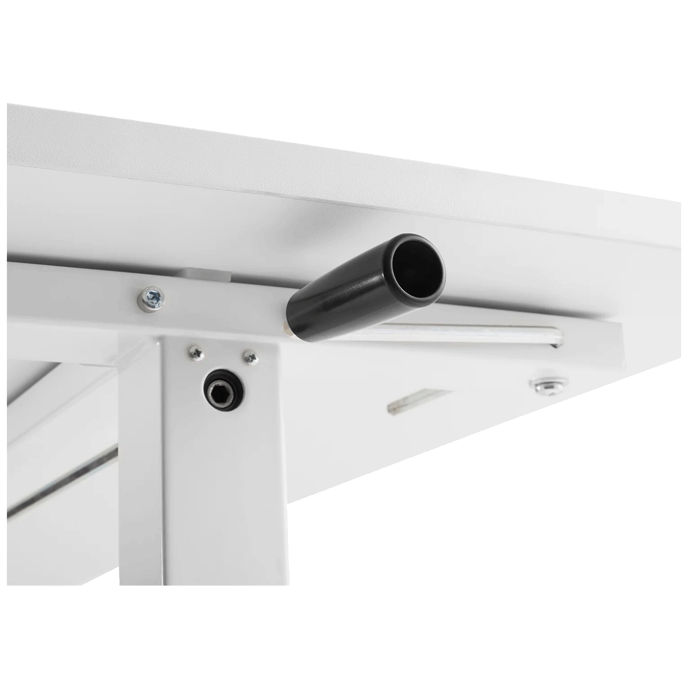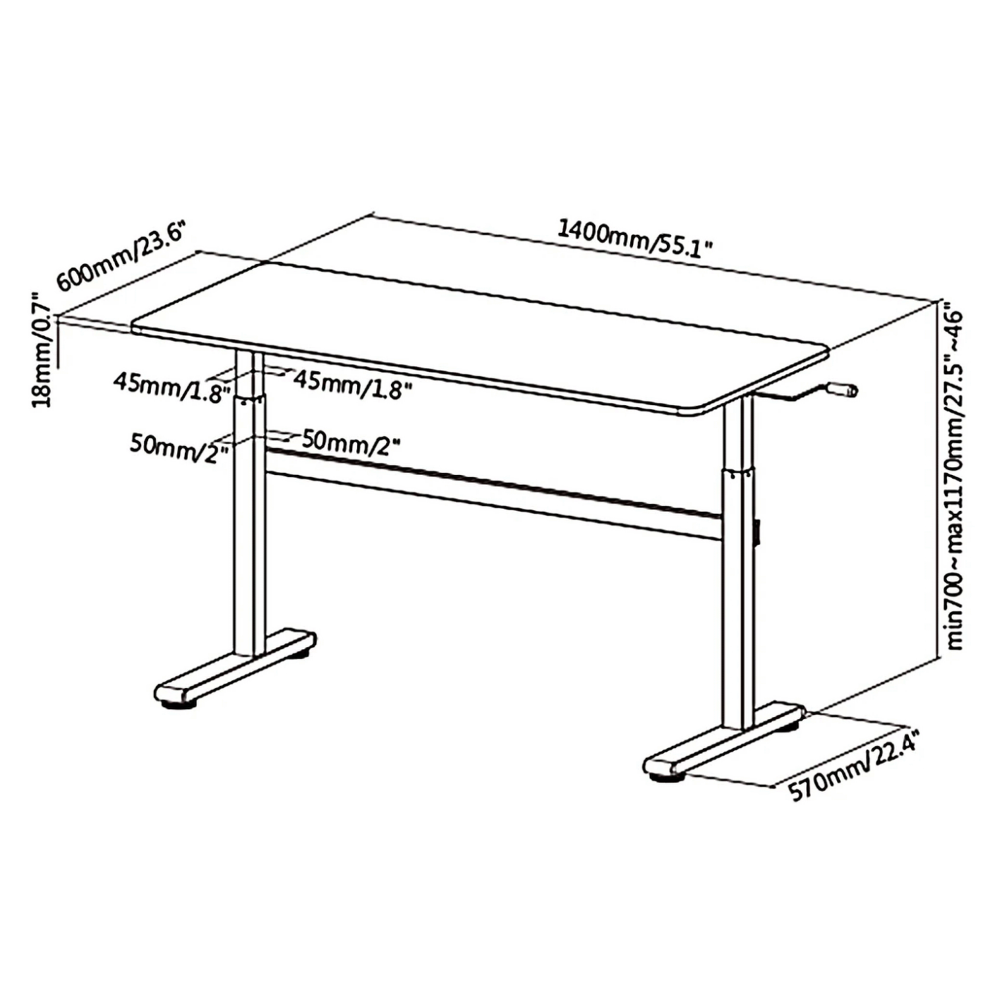Stol zadržava jednostavnost i funkcionalnost: ručna ručica omogućava fluidno podizanje i spuštanje radne površine bez potrebe za električnim motorima. Radna ploča dimenzija 140 × 60 cm pruža dovoljno prostora za laptop, monitor, tipkovnicu, dokumente i dodatnu opremu.