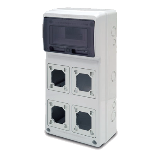 Kombinovani kutija za osigurače i industrijske utičnice, nadžbuk , 8 osigurača, 4 utičnice, IP65 zaštita, IK08 standard otpornosti na udar.