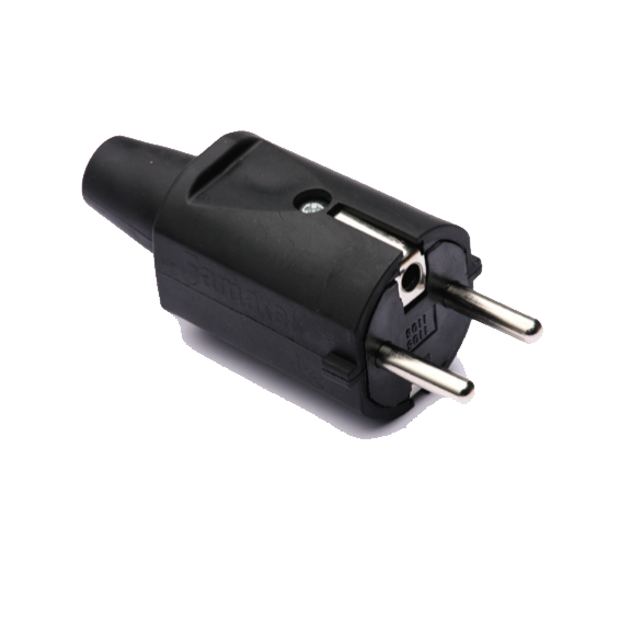 Strujni utikač Schuko, 2P+E (sa uzemljenjem), gumirani ,16A/250V, 2500W, IK07, radna temperatura, -25ºC + 85ºC, standard UNE 20315-1-1 / UNE 20315-1-2, crna boja.