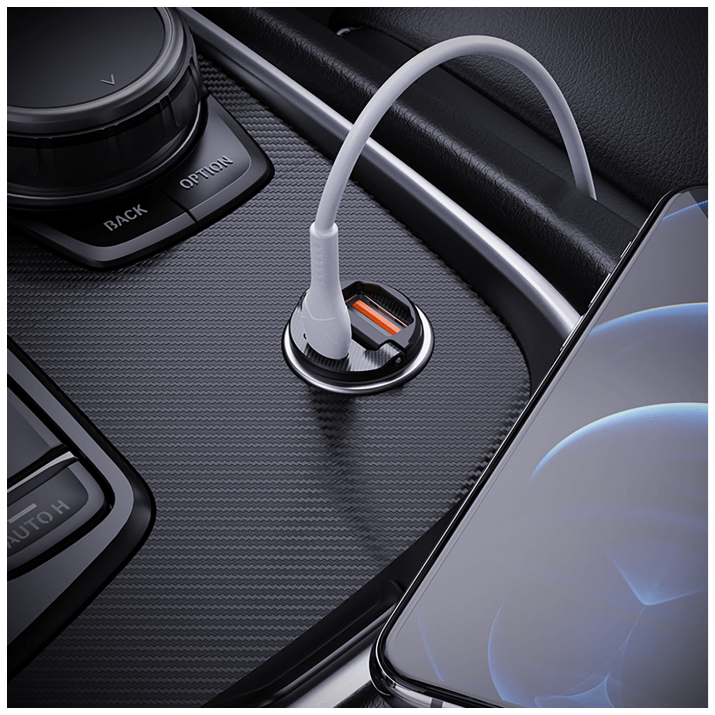 Univerzalni USB Auto punjač sa Lightning kabelom, brzi punjač standard PD + QC3.0, 2 x USB, ulazni napon 12-24 V, izlazni napon USB-A: 30W, Type-C PD 30W, USB-A + Type-C 5V / 4.8A, dimenzije 42.5 x 22 mm, tezina 32 g, dužina kabela 1 met.