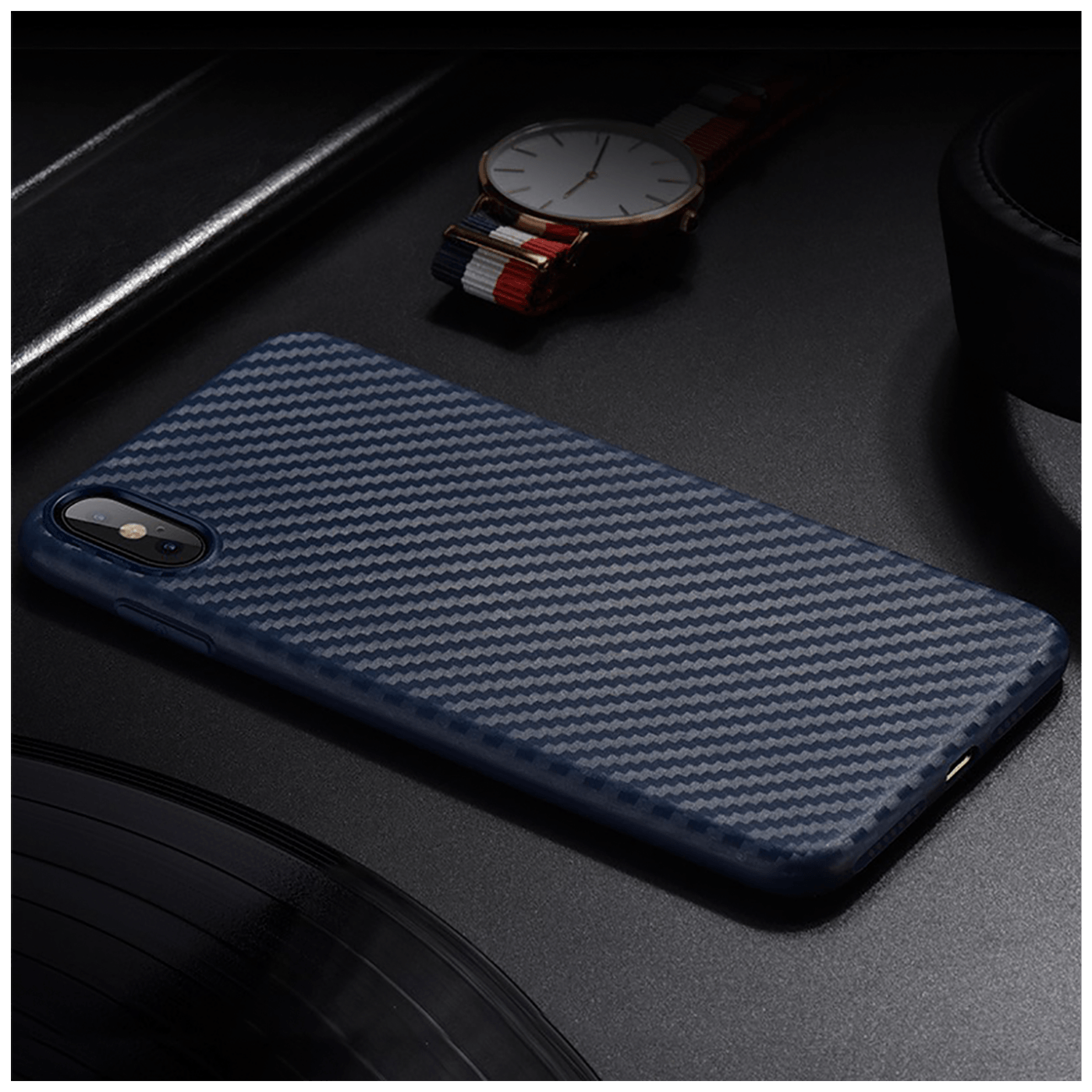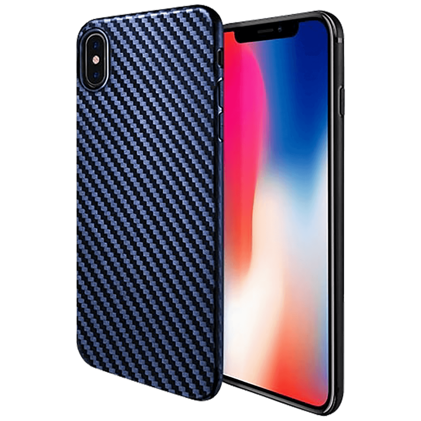 Navlaka za iPhone X / XS, plava, debljina navlake 0.8 mm, materijal izrade TPU, površina sa karbonskim vlaknima otporna na padove i habanje, jednostavno umetanje i vađenje, savršeno pristaje uz telefon, štiti telefon od prašine, ogrebotina i udara
