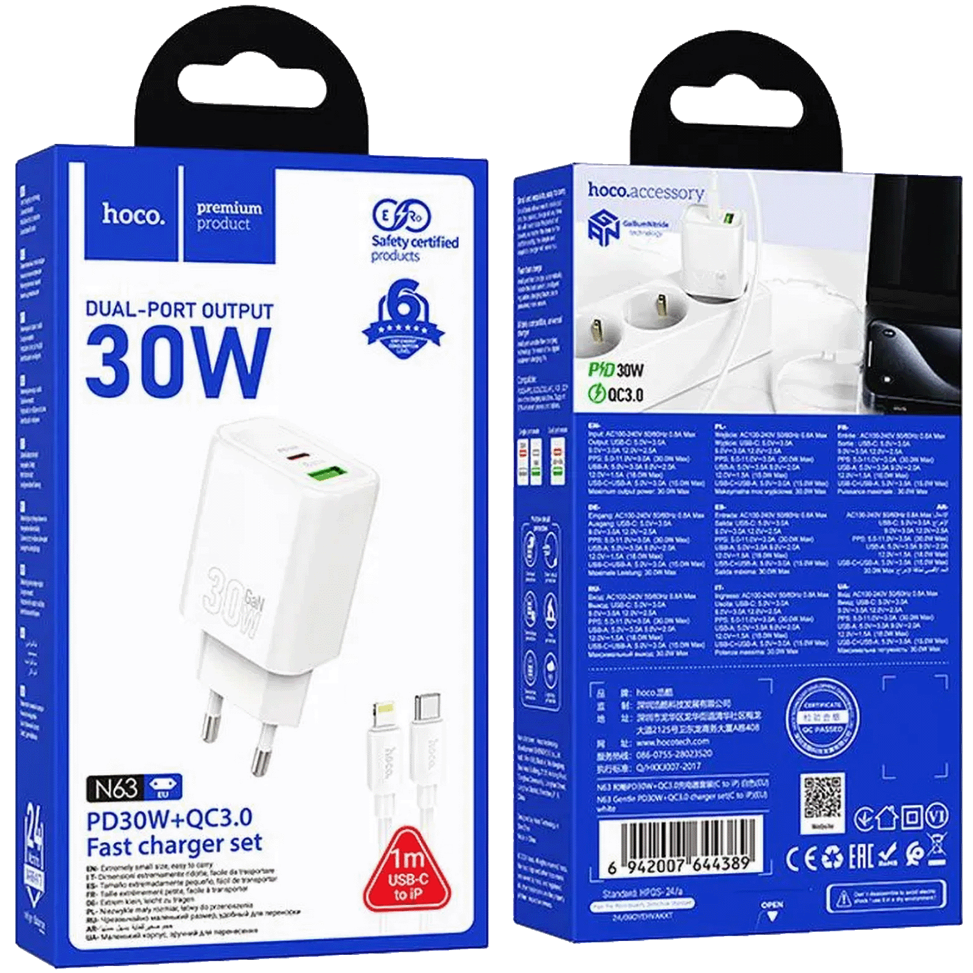 Hoco N63 zidni punjač s funkcijom brzog punjenja i dvostrukim izlazom. Omogućuje brzo punjenje mobilnih uređaja. Uključeno s 1-metarskim USB -C – Lightning kabelom.