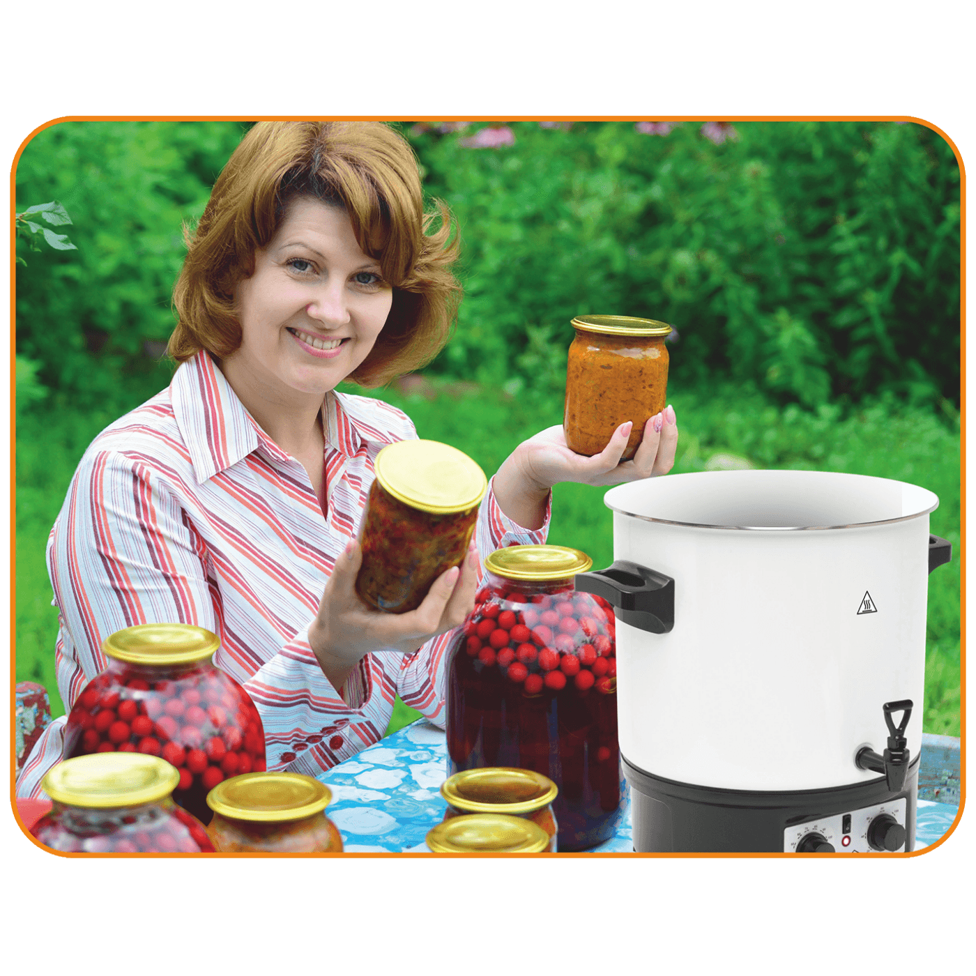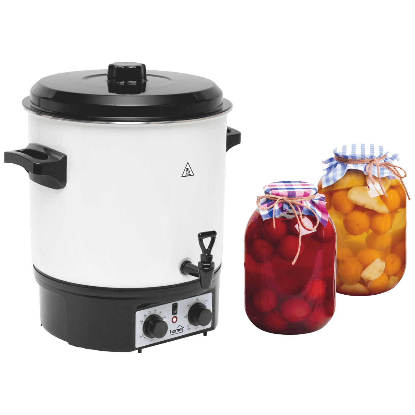 Aparat za sterilizaciju, prokuhavanje hrane, 27 - litreni emaljirani spremnik, za sterilizaciju 14 staklenski od 1 litre, max. 27 litara tekučine za grijanje, ključanje, održavanje toplote ( čaj, kuhano vino ), odvodni ventil, mehanički termosta, timer za isključenje max. 120 minuta, izolirane ručke, dužina napojnog kabela 90 cm, diemnzije 460 x 480 x 430 mm
