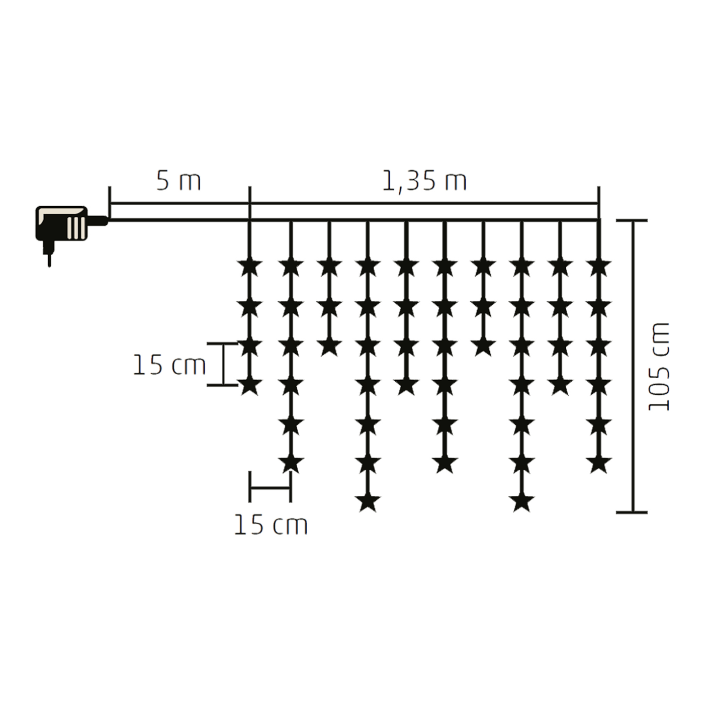 Dužina niza je 1.35 met. na kojoj 50 toplo bijelih LED zvjezdica koje mogu osvijetliti vaš dom i tako stvoriti ugodnu, mirnu božićnu atmosferu.