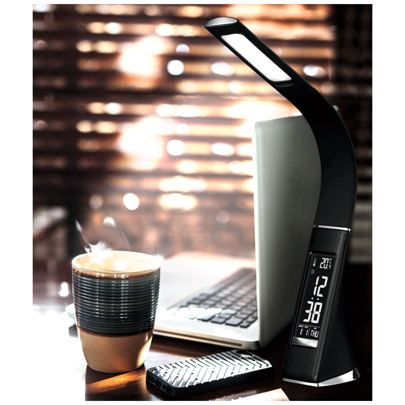LED stolna lampa, 3 razine svjetlosti osjetljive na dodir, bijeli LCD zaslon, prikaz na LCDzaslonu: sat, 12/24 format, termometar, kalendar, dan u tjednu, alarm, izvor svjetlosti 25 LED lampica, 7W, osvjetljenje 400lm, boja svjetlosti hladno bijela - 5000K, fleksibilna, napajanje adapter USB 5V / 1A / 1 x CR2032 baterija
