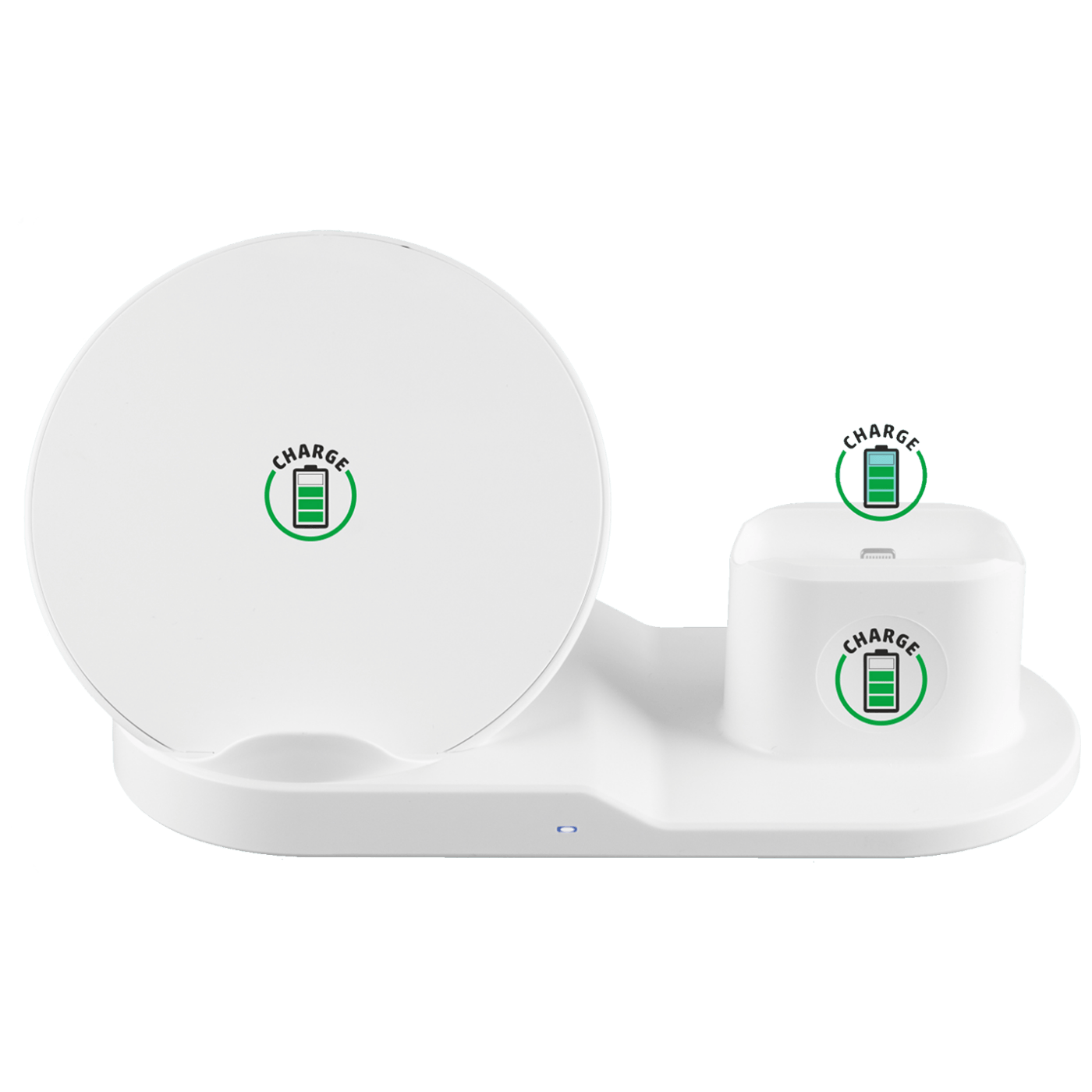 Punjač bežični, 3u1, istovremeno punite telefon, sat i slušalice, prikladna veza jednim kabelom, telefon se može postaviti u vodoravni i okomiti položaj, kompatibilnost telefona neovisna o proizvođaču ako telefon podržava Qi standard bežičnog punjenja, bežični punjač za sat ( iWatch ), punjač za slušalice ima ugrađen Lightning utikač (npr. Airdots), višebojni LED indikator, USB / USB C kabel za punjač u pakiranju, dimenzije 200 x 100 x 85 mm