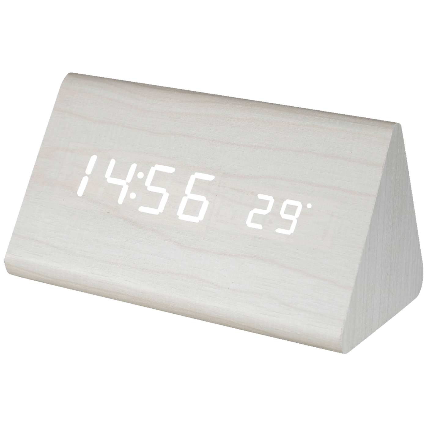 Digitalni sat sa alarmom, atraktivan dizajn, materijal izrade kućišta drvo, jasno bijeli LED display sa prikazom sat / datum / temperatura, 12/24 format vremena, temperatura od 0 .....50°C, alarm " beep", interval 1 min, 3 alarmska vremena istovremeno, LED display je moguće ugasiti, aktivacija LED display-a u OFF modu na dodir, alarmom, pljeskanjem rukama.