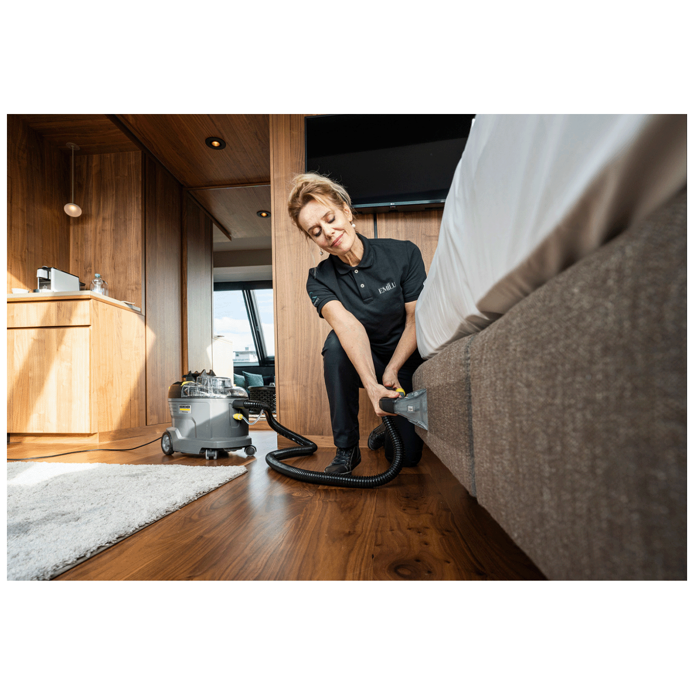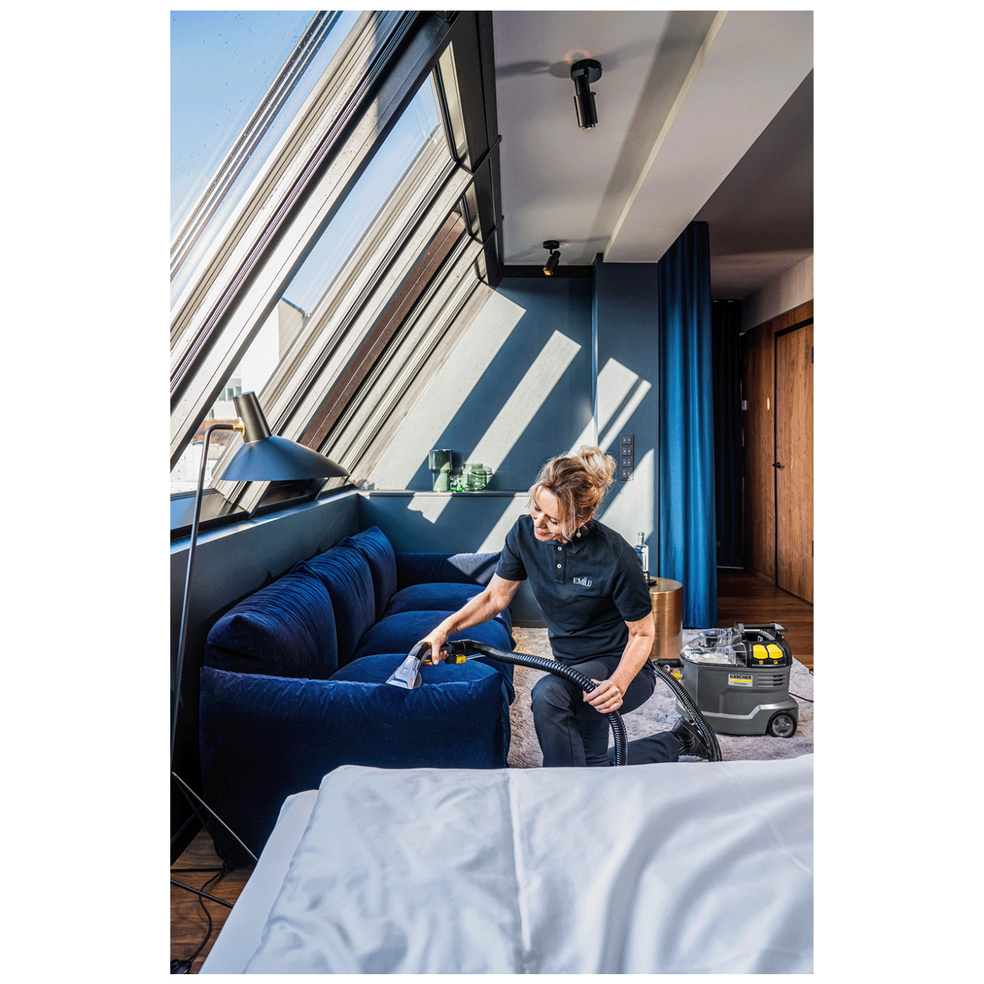 Robustan, izdržljiv, učinkovit: Puzzi 8/1 uređaj za ekstrakciju i prskanje iz Kärchera impresivno čisti presvlake i uklanja mrlje s tekstilnih površina s izvanrednim i higijenskim rezultatima čišćenja i visokom učinkovitošću.