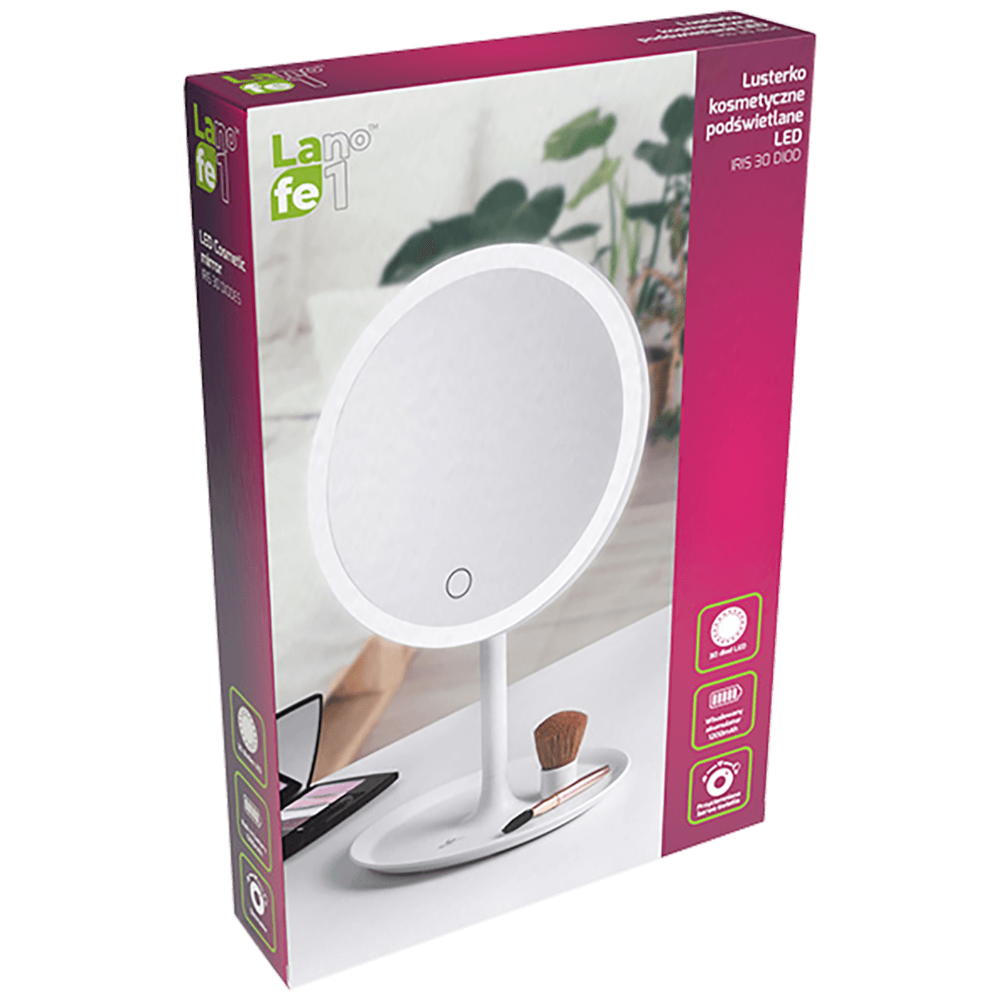 Kozmetičko ogledalo sa LED diodama, temperatura boje 500-7000 K, izvor svjetlosti 30 2835 SMD dioda, boja svjetla bijela, podesivi ugao svjetla 60-80°, jačina svjetlosti 50 lumen, baterija 1000 mAh, punjenje putem USB priključka, materijal izrade ABS / staklo, dimenzije 190 x 310 mm, težina 368 g