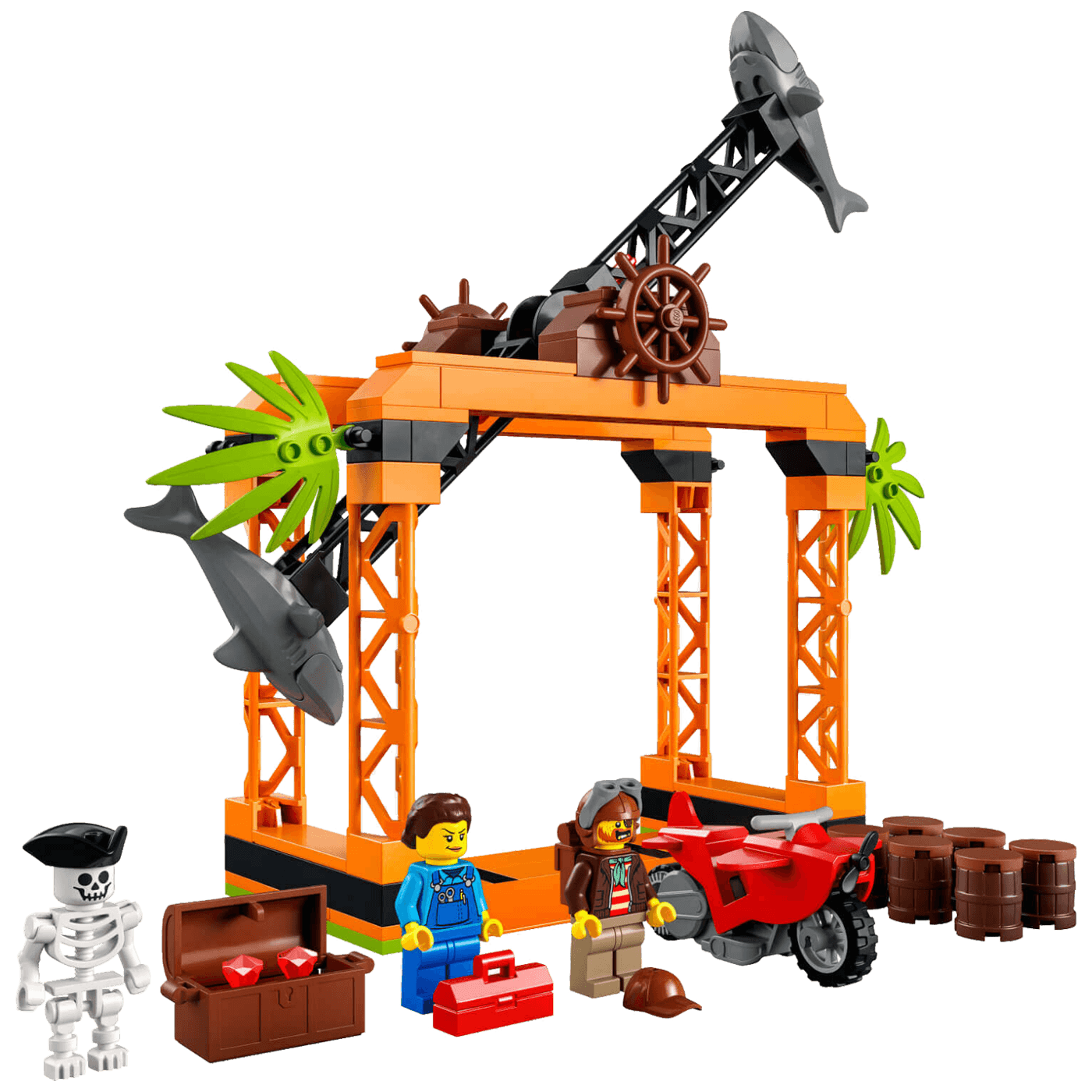 Pridruži se pilotu iz televizijske serije LEGO® City Adventures Chucku D. Goldbergu u zabavnim vratolomnim priredbama i takmičenjima. Zauzmi položaj u Vratolomnom izazovu s morskim psima, pokreni krilati motocikl za vratolomije i pusti ga! Izbjegavaj kolo s morskim psima i pogodi bačve da otkriješ škrinju punu dijamanata. No pazi se strašnog kostura koji čuva blago!