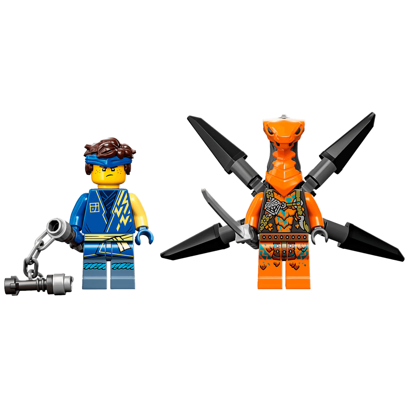 • Sadrži 2 figurice – u kompletu igračaka za slaganje dolaze Jay s nunčakama, koji se može ojačati kapuljačom i mačem, i Leteća Guja, zlikovac naoružan mačem i mlaznim pogonom.