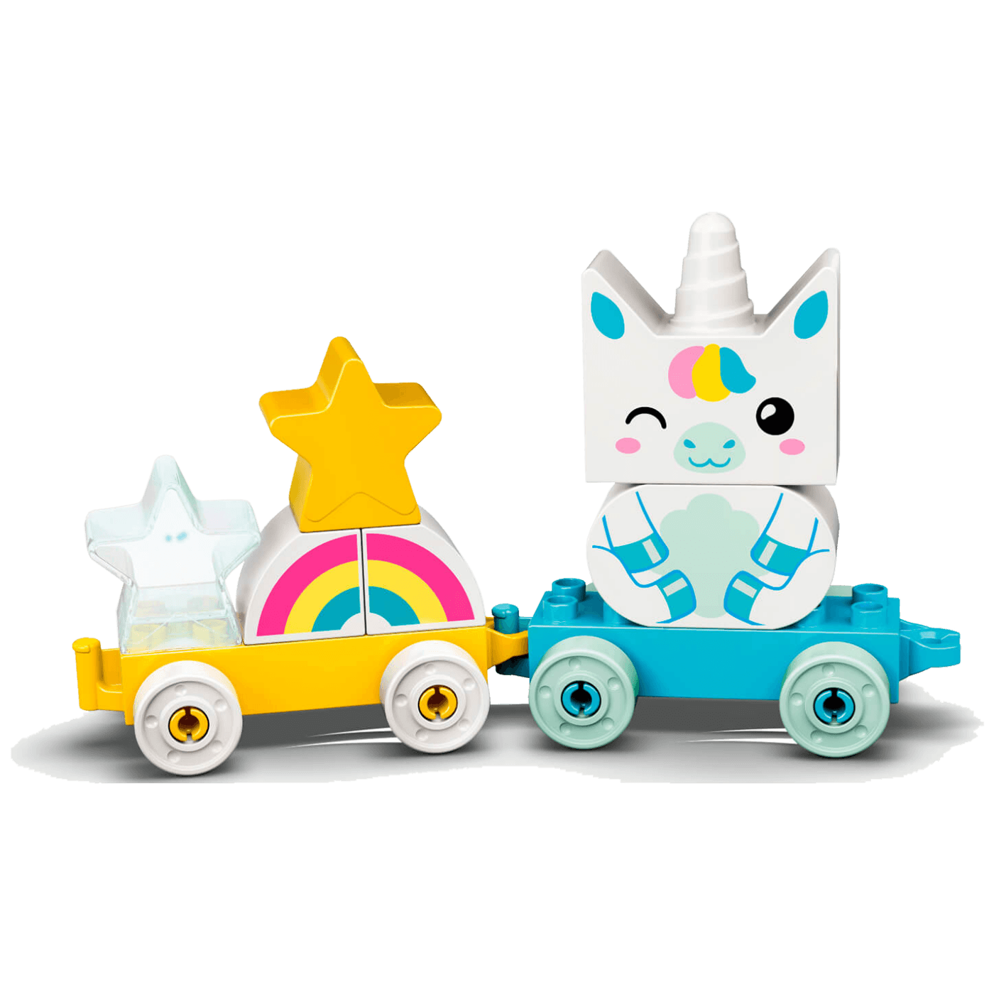 Slatki jednorog na povlačenje privlači djecu u maštovitu igru kroz koju razvijaju osnovne vještine slaganja i uče o oblicima i bojama. Mogućnosti igre i učenja nemaju kraja uz glatke oblike koje male ruke mogu jednostavno podignuti i skinuti sa vagona ili ih staviti na njih. Kada se žele još više zabaviti, djeca mogu spojiti vagon sa drugim igračkama sa točkovima iz serije LEGO® DUPLO®.