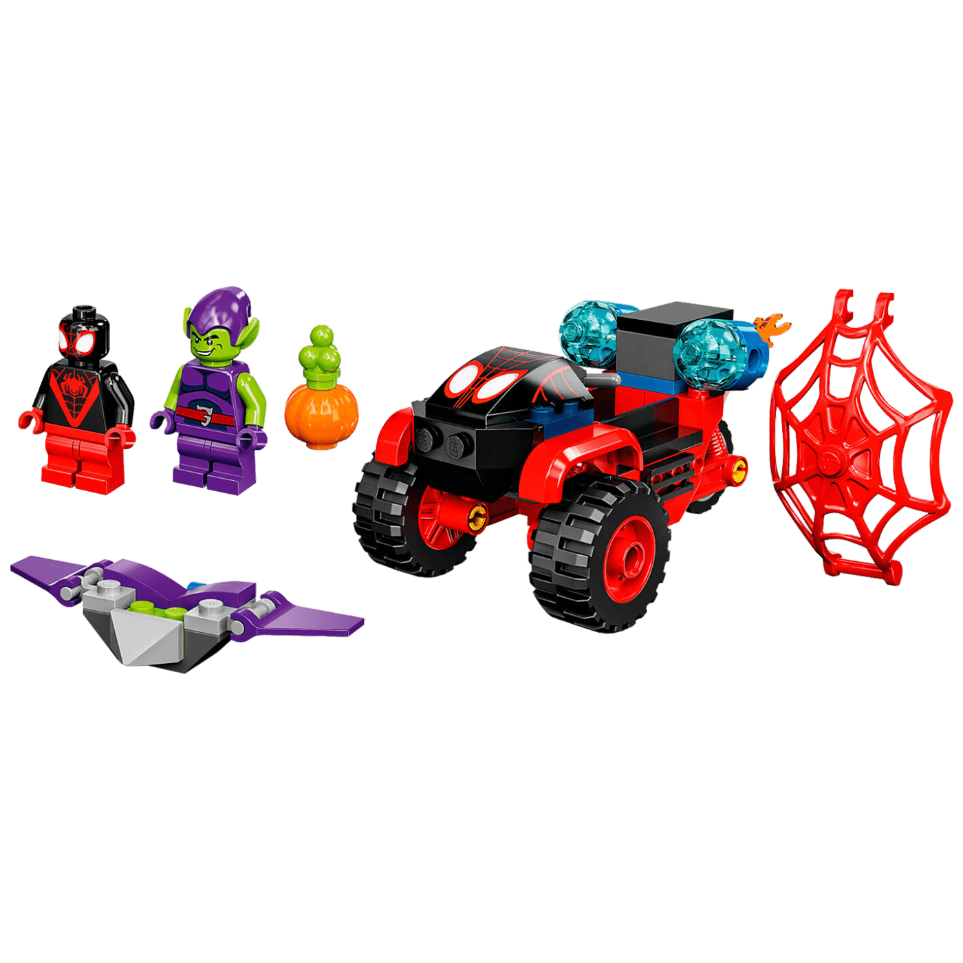 • Komplet za igru spašavanja – djeca mogu poslati Milesa Moralesa u odijelu Spider-Mana na triciklu u potjeru za letačem Green Goblina. Mogu ga uhvatiti u crvenu mrežu i srušiti ga