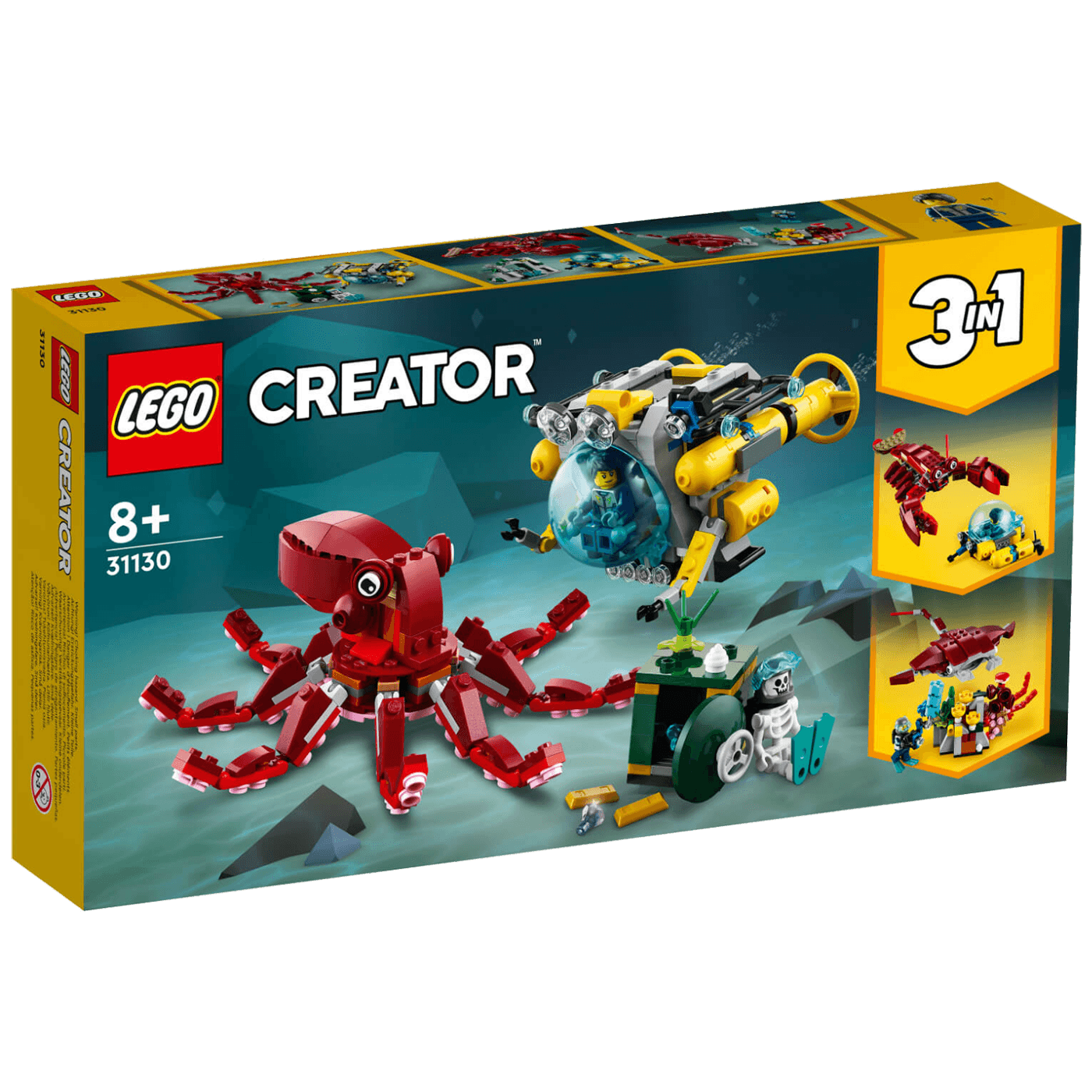 Uživaj u nevjerovatnim podvodnim pustolovinama uz tri različita LEGO® kompleta igračaka. Zaroni do morskog dna u podmornici i traži potonulo blago koje čuva hobotnica. Poslije ga pretvori u manju podmornicu za više akcije s ogromnim jastogom ili u veliku ražu i zabavi se s roniocem na koraljnom grebenu. Nema kraja mogućnostima igre uz sjajni komplet 3-u-1.