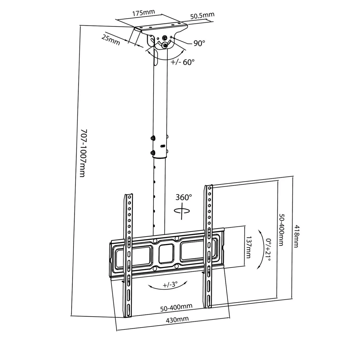 Zahvaljujući teleskopskoj ručki, udaljenost TV postolja od stropa može se podesiti između 707 i 1007 mm.