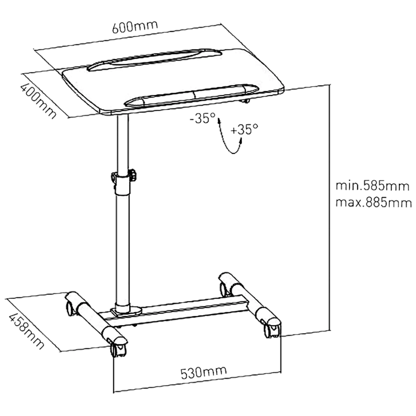Podešavanje visine 585 - 885 mm, podešavanje nagiba 35° do -35°, kotači sa nosačima, obostrana zaštita od pada
