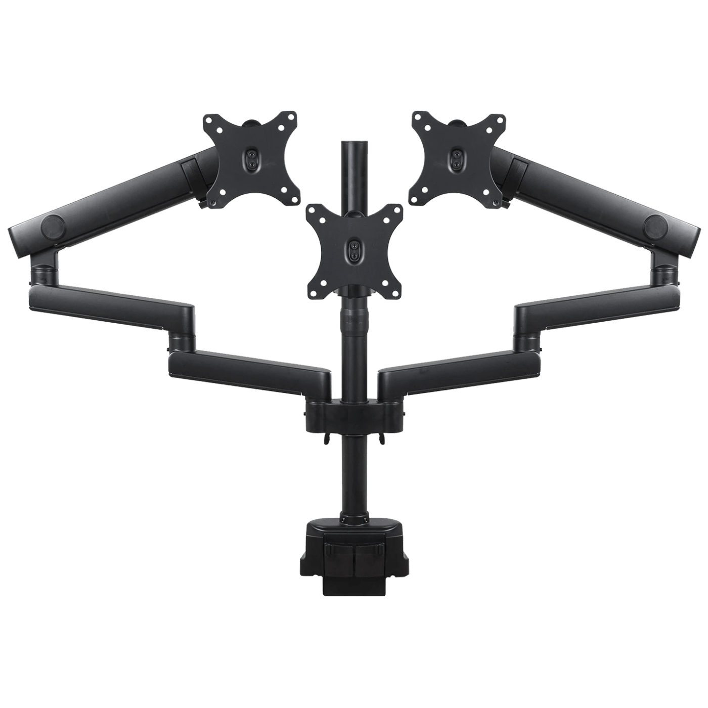 Držač za 3 monitora MC-811 pruža veliku udobnost i optimizuje ergonomiju dok radite na računaru. Zahvaljujući podesivom kutu nagiba i mogućnosti rotacije i promjene visine, nosač osigurava da se položaj prilagodi individualnim željama. Ruke su izrađene od visokokvalitetnog aluminija - opremljene su izdržljivim nosačem za montažu koji omogućava pričvršćivanje na vrh stola ili druge ravne površine.