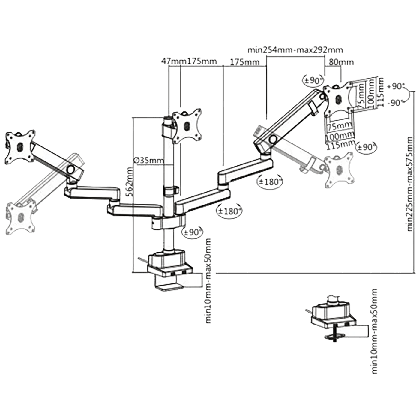 Nosivost do 21 kg. 7 kg.po nosaču, podesivi nagib od + 90° ~ -90°, podešavanje rotacije + 90° ~ -90°, podešavanje visine 225 mm - 575 mm, organizacija kablova, 2 x USB3.0 utičnice, VESA razmak rupa od 75 x 75 ili 100 x 100 mm, plinske opruge