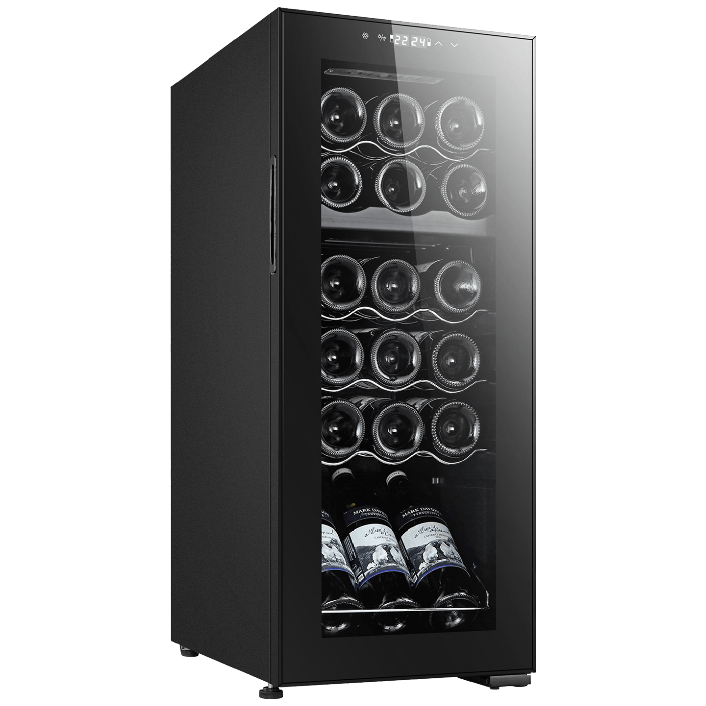 Rashladna vinska vitrina, kapacitet 18 boca, zapremina 50 litara, sustav hlađenja s kompresorom, unutarnje LED svjetlo, regulacija temperature gornja razina 5 - 18°C, regulacija temperature donja razina 5 - 18°C, zaslon na dodir s prikazom temperature, vrata od kaljenog stakla sa UV filterom, kromirane police, razina buke 46dB, energetski razred G.
