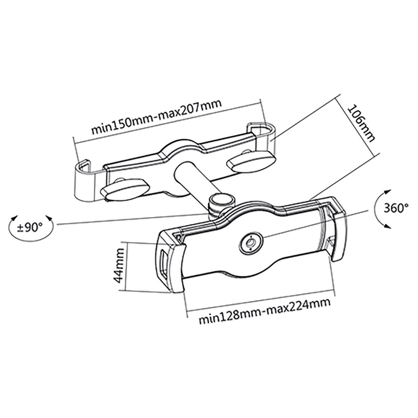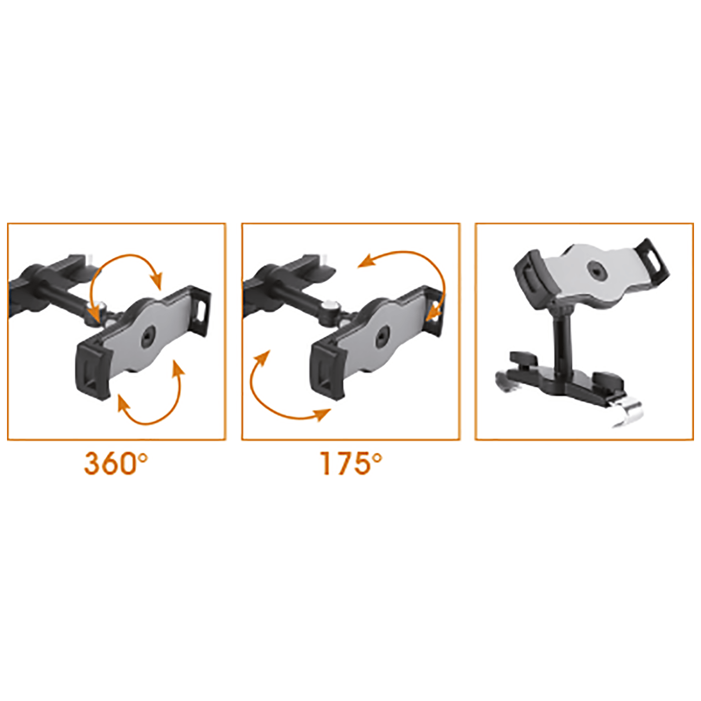 Auto nosač za tablet, 4.7" - 12.9", montaža na naslonjač za glavu, nagib 175°, zakretanje 360°, raspon stezaljki 12.8 - 22.4 cm