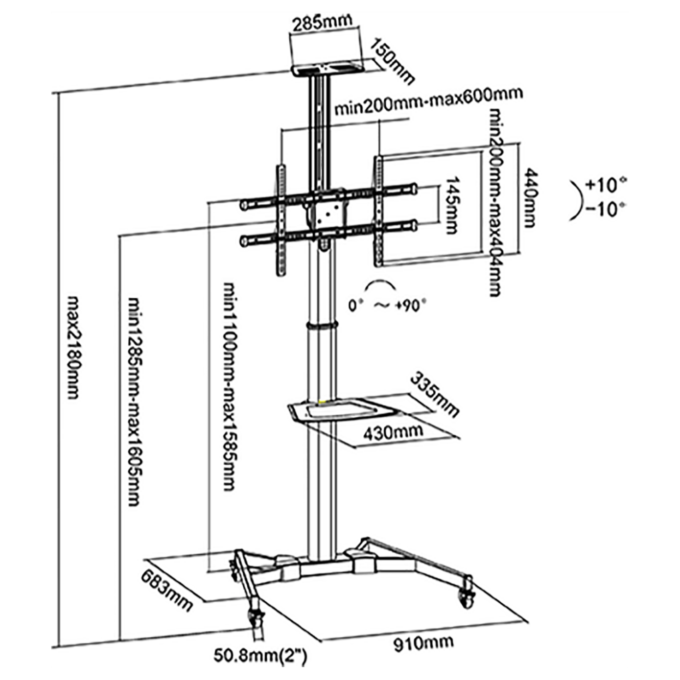 Stalak za TV prijemnike 37" - 70", maksimalno opterećenje 50 kg., VESA 200 x 200, 600 x 400, nagib + / - 10°, polica za AV uređaj 430 x 335 mm nosivosti 5 kg., polica za kameru 285 x 150 mm, kotačići za lakše pomjeranje, pribor za montažu