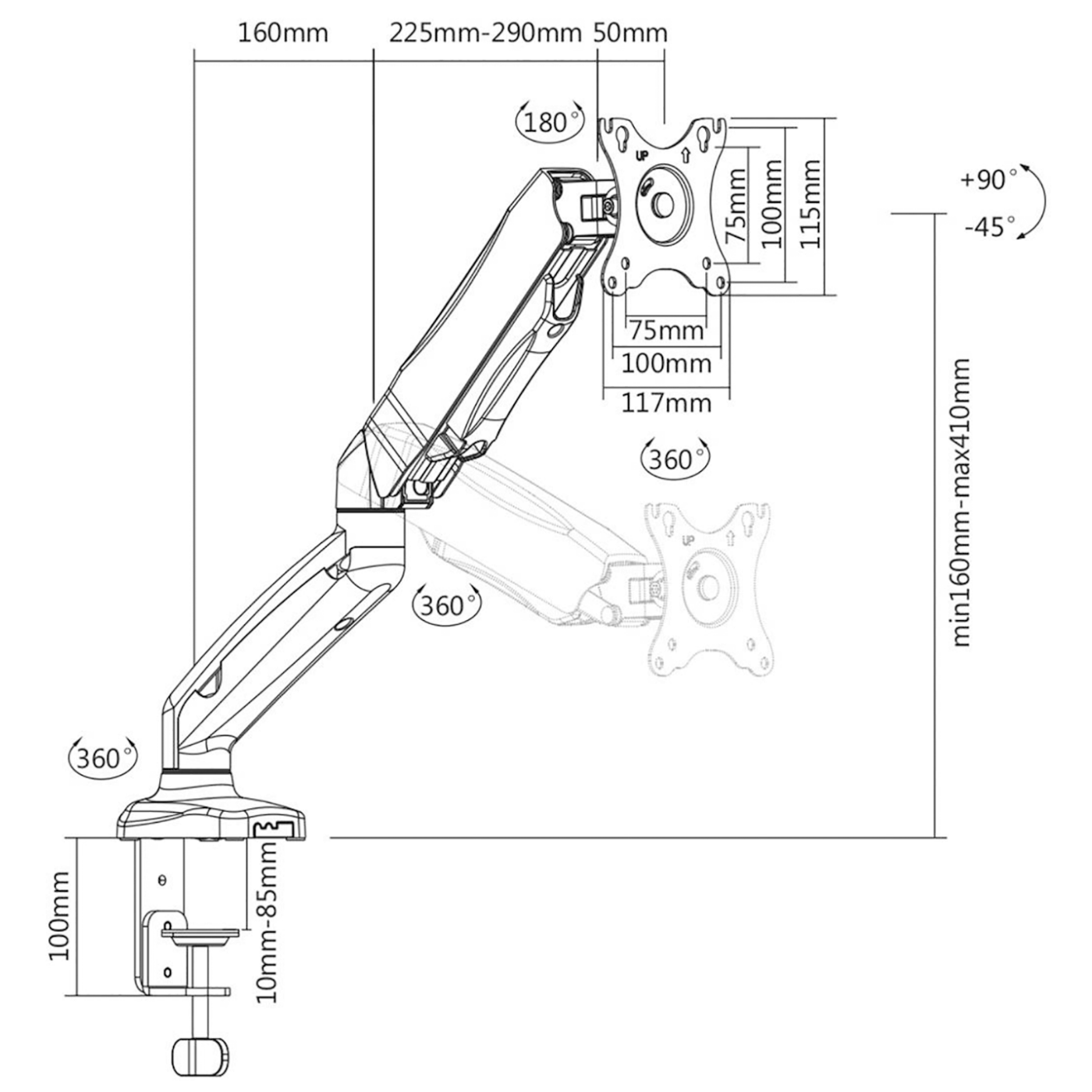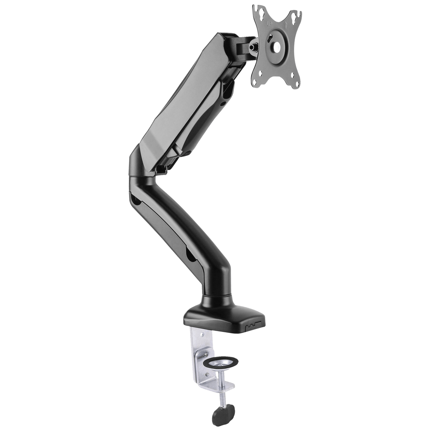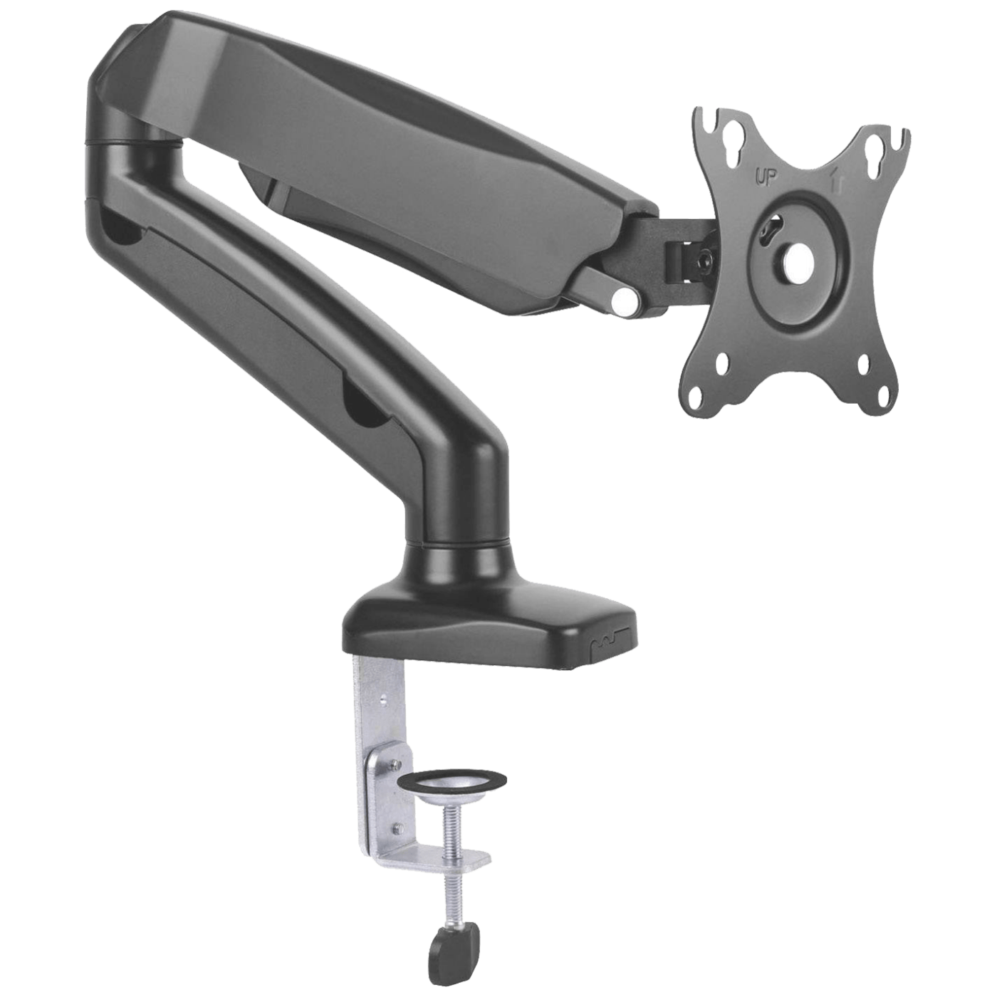 Stolni nosač za LCD monitor, veličine ekrana 13 - 27", nosivost 2 - 6.5 kg, VESA: 75 x 75, 100 x 100, nagib + 90° / -45°, rotacija 360°, stezaljka za montažu ( 10 - 85 mm ), ploča adapter za fiksnu montažu, integrirana plinska opruga za glatko okomito podešavanje zaslona (maks. do 250 mm), pribor za montažu