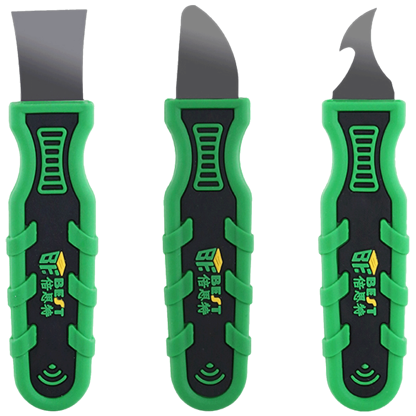 2. Uključene su 3 vrste vrhova: ravni se koriste za otpuštanje ili otpuštanje komponenti unutar elektronike, na primjer prilikom zamjene baterija ili ekrana osjetljivih na dodir za pametne telefone; zakrivljeni i šiljasti se koriste za stvaranje početnog jaza i druge primjene.