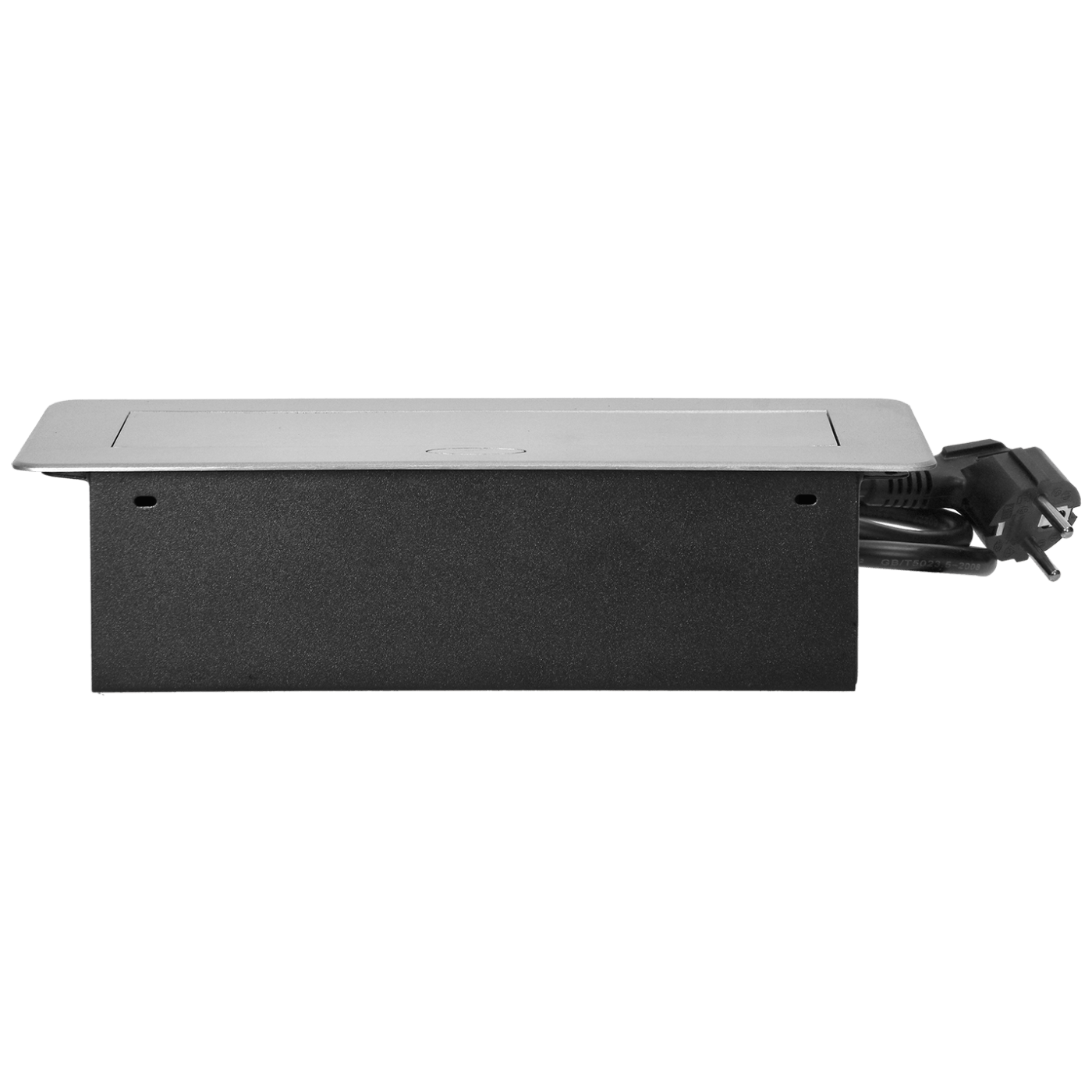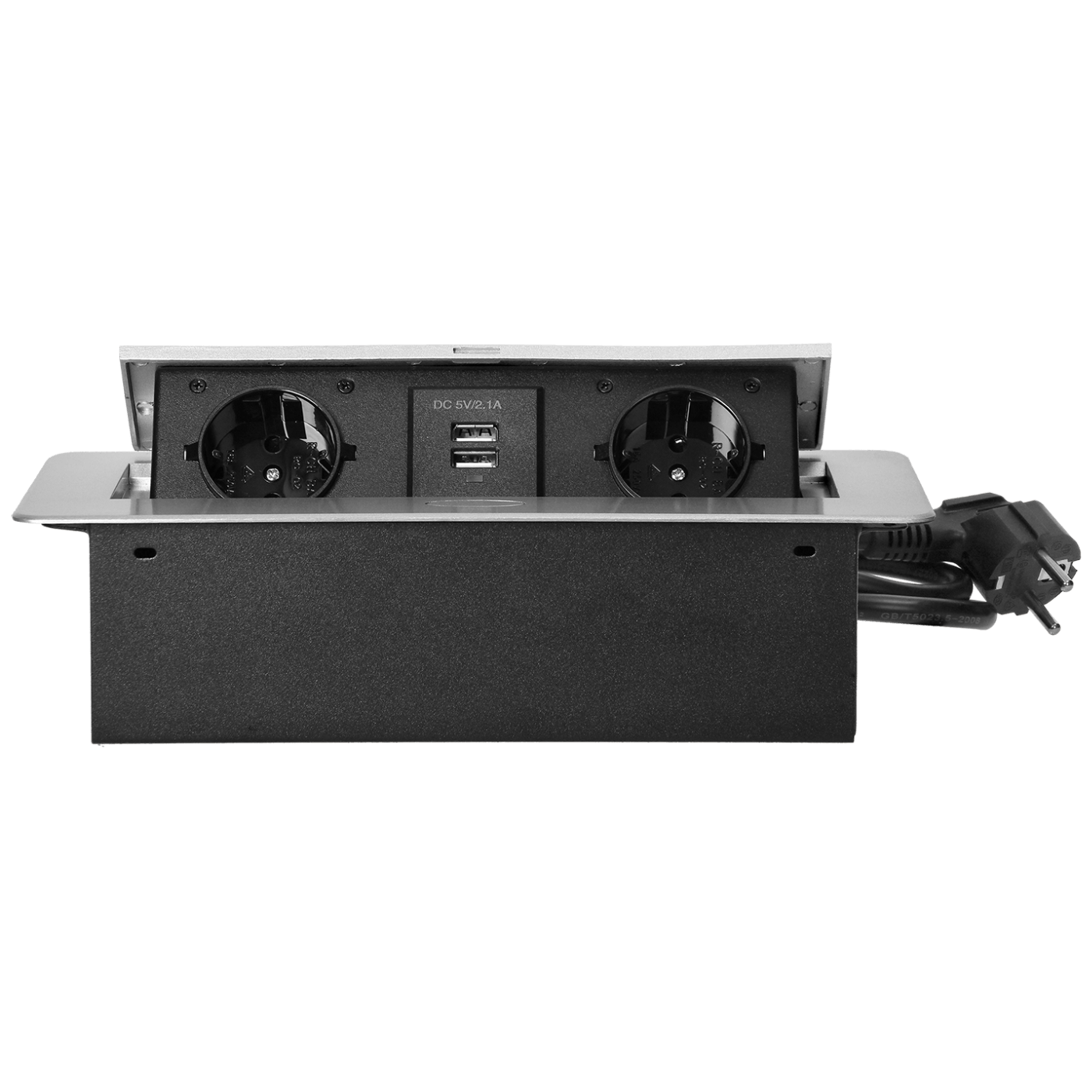 Produžni kabel sa dvije Schuko utičnice, sa uzemljenjem i zaštitom strujnog kruga, u kombinaciji s USB punjačima ugrađenim u kućište koje se može integrirati u stolove, radne površine, može se montirati i okomito i vodoravno, pružajući praktičan pristup električnim utičnicama.