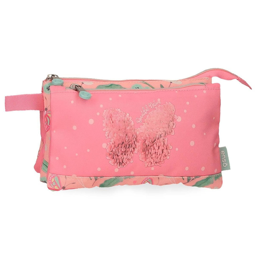 Sa dvije/tri nezavisne pregrade: jedna nezavisna sa patent zatvaračem i druga sa dve unutrašnje otvorene pregrade koje se zatvaraju zajedničkim patentnim zatvaračem. Komplet je pogodan za sav mali školski pribor i drugo. Materijal: poliester. Dimenzije: 22 x 12 x 5 cm.