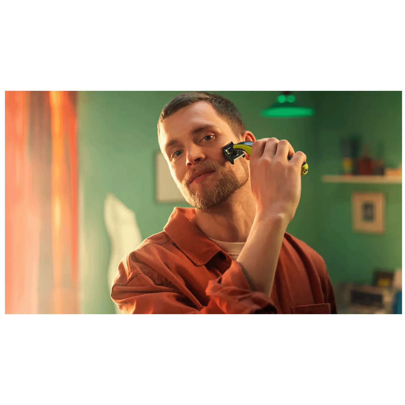 OneBlade prati konture lica, omogućavajući jednostavno i ugodno podrezivanje i brijanje svih dijelova lica. Dvostrana oštrica omogućava oblikovanje rubova i jasnih linija pomicanjem oštrice u bilo kojem smjeru.