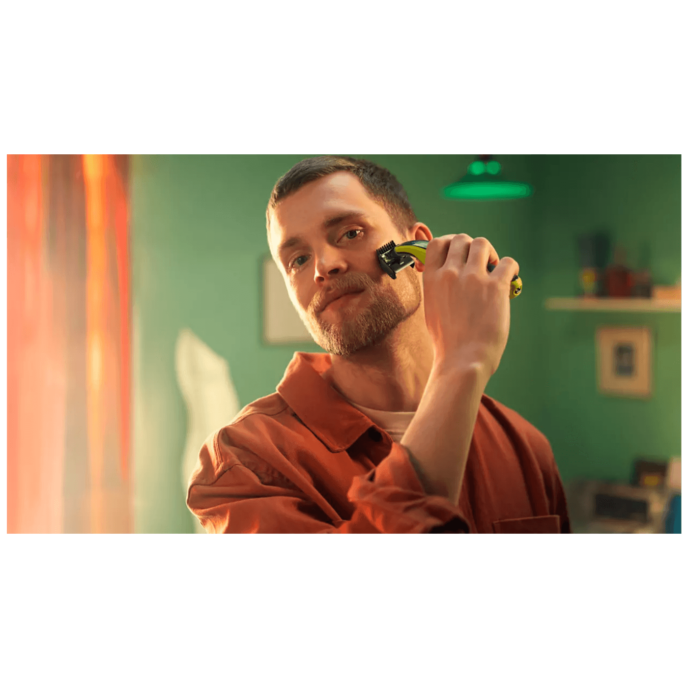 Philips OneBlade revolucionarni je novi hibridni aparat za oblikovanje koji može podrezivati, brijati te oblikovati jasne linije i rubove bez obzira na duljinu dlačica. Upotreba više aparata u nekoliko koraka stvar je prošlosti. OneBlade sve radi sam.