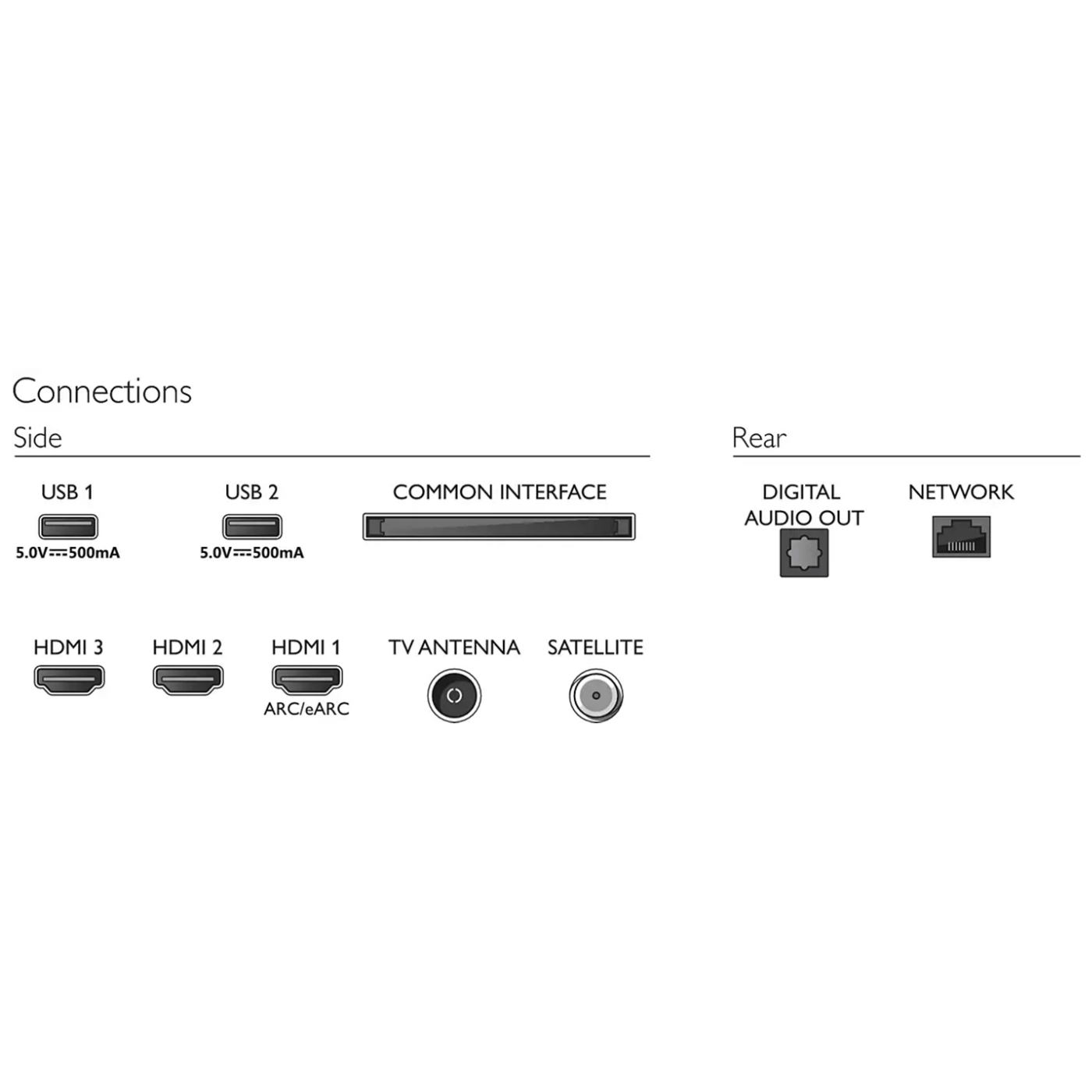 Povezivost: HDMI x 3, USB x 2, WiFi 802.11 n, satelitski priključak, CI+, digitalni audioizlaz ( optički ), LAN- RJ-45 , izlaz za slušalice, setvisni priključak.