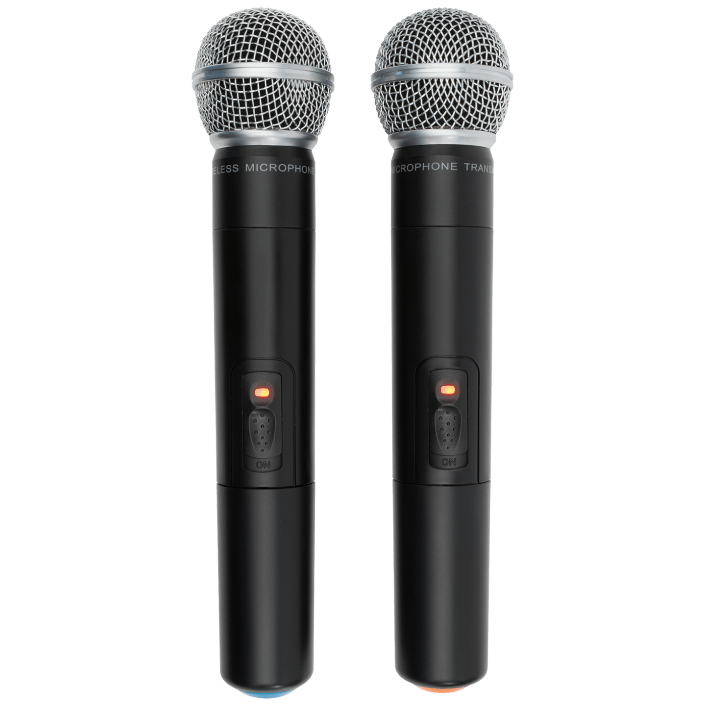 Set 2 bežična mikrofona i prijemnik , domet do 100 met. ( na otvorenom ), radna frekvencija 518 - 766 MHz, audio izlaz 0 - 500 mW, osjetljivost 105 dB, sučelje XLR / Ø6.3 mm jack, dimenzije: mikrofon Ø55 / 45 x 240 mm, prijemnik 210 x 45 x 140 mm, napajanje : mikrofon 2 x AA baterije ( nisu uključene u pakiranje ), prijemnik 100 - 240 V ~