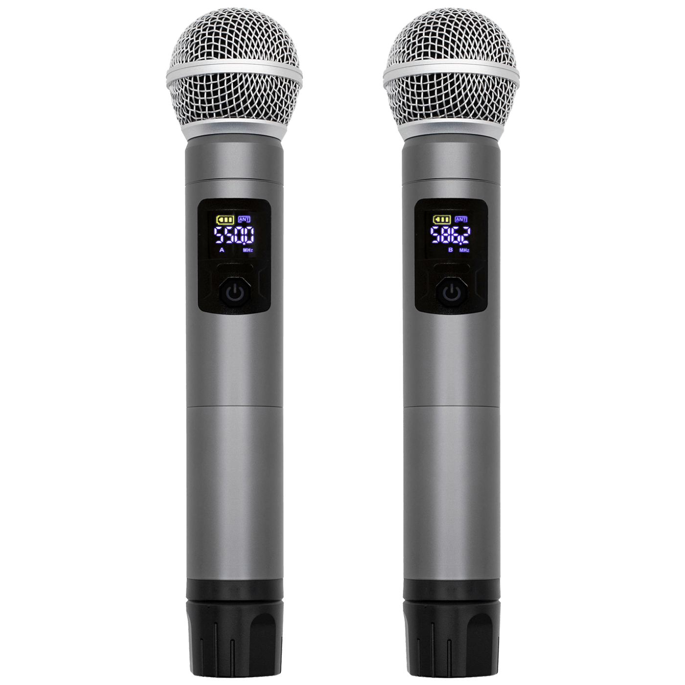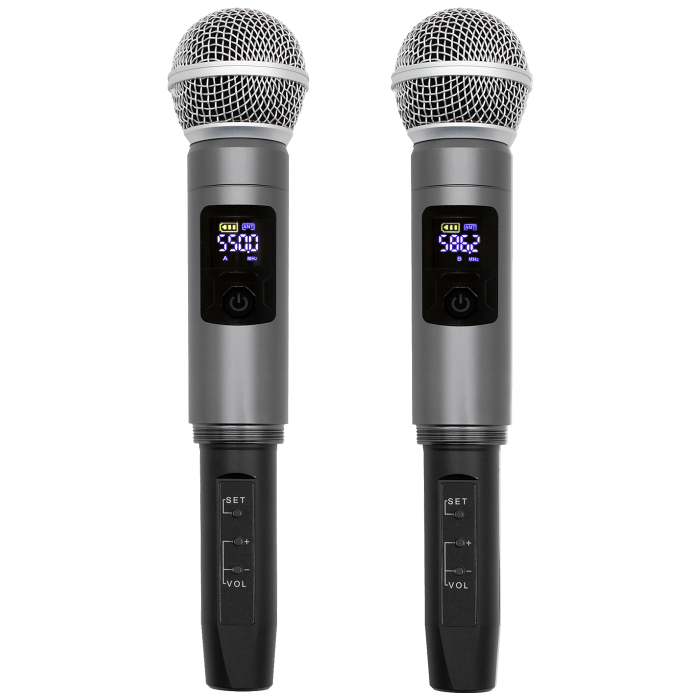 Set 2 bežična mikrofona i prijemnik , domet do 80 met. ( na otvorenom ), radna frekvencija 518 - 690 MHz, audio izlaz ~ 500 mV, osjetljivost 102 dB, frekvencija 50 - 18.000 Hz, sučelje 2 x XLR / Ø 6.3 mm jack, robusni metalni ručni mikrofoni, multifunkcionalni digitalni display, prikaz: frekvencija / kanal / status baterije, AF merač nivoa audio signala, digitalno kolo za poništavanje buke, 2 x 30 kanala koji se mogu birati, brzo bežično uparivanje, uključivanje / isključivanje napajanja bez buke, dimenzije: mikrofon Ø 50 / 35 x 250 mm, prijemnik 210 x 50 x 180 mm, napajanje: mikrofon 2 x AA baterije ( nisu uključene u pakiranje ), prijemnik AC adapter, težina: mikrofon 2 x 260 g., prijemnik 700 g.