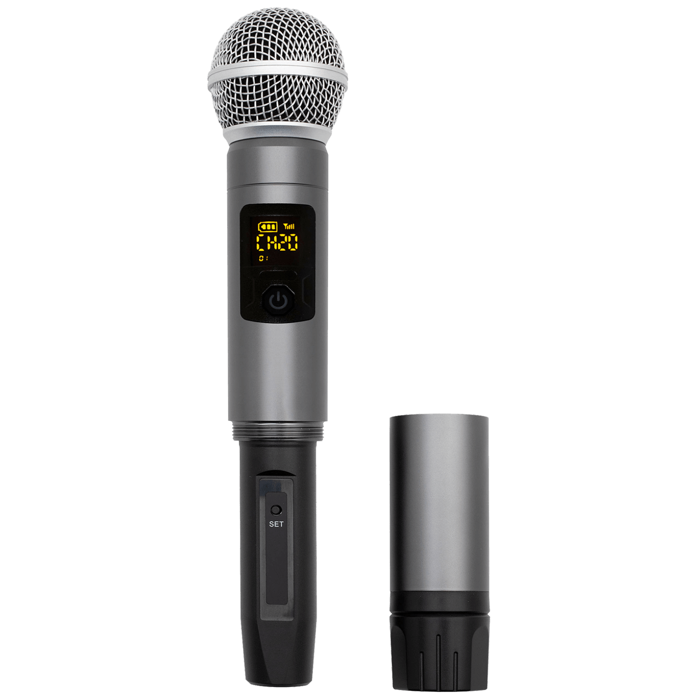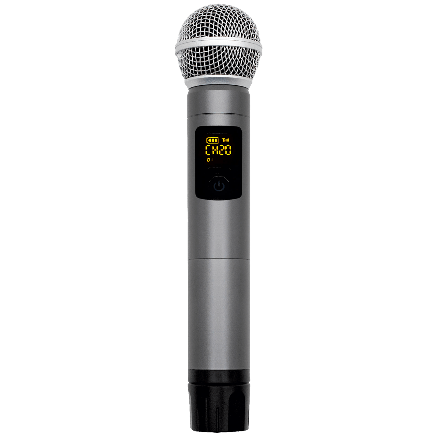 Bežični set, profesionalni mikrofon i prijemnik, višenamjenski digitalni zaslon na ručki, prikaz frekvencije / kanal / stanje baterije, digitalni filter šuma, automatsko uparivanje, 20 kanala koji se mogu odabrati za prijem bez smetnji, Ø6,3 mm priključak za mikrofon na prijemniku, punjivi prijemnik se može izravno priključiti na pojačalo, domet na otvorenom prostoru do 40 m, frekvencijski opseg 550-565,2 MHz, dimenzije mikrofona Ø50 / 33 x 240 mm, napajanje mikrofona 2 x AA (1,5 V) baterije, nisu uključene u pakiranje, diemezije prijemnika Ø80 x 42 x 17 mm, napajanje prijemnika ugrađena Li-Ion baterija 500 mAh, vrijeme punjenja / vrijeme rada cca 2,5 / 6 h, pribor kabel za punjenje USB – microUSB (1.0 m)