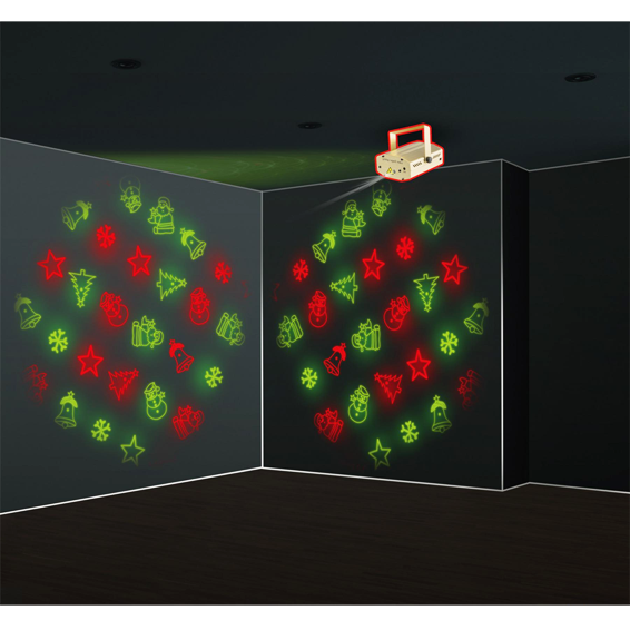 Disco laser, crvena i zelena promjenjiva svjetlost, rotirajuće siluete ( blagdanska dekoracija )i stroboskop efekt, podesiva brzina, pogodno za veće površine ( do 400 m2 ), ugrađen mikrofon , prati ritam muzike, postavljanje na namještaj ili montaža na zid ili strop