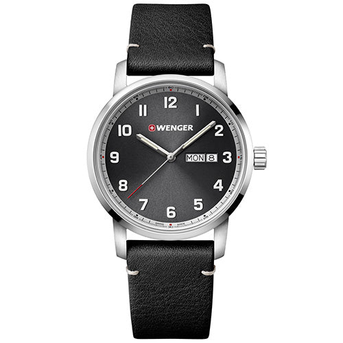 Muški sat Wenger koristi precizan kvarcni mehanizam. Model se sastoji od srebrnog kućišta od nehrđajućeg čelika, brojčanik u crnoj nijansi opremljen žigom za datum i mjesec i crnim kožnim remenom.
