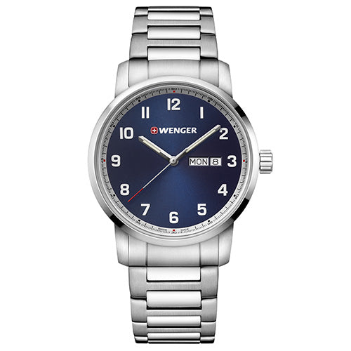 Muški sat Wenger koristi precizan kvarcni mehanizam. Model se sastoji od srebrnog kućišta od nehrđajućeg čelika, brojčanik u tamnoplavoj nijansi opremljen žigom za datum i srebrna narukvica od nehrđajućeg čelika.