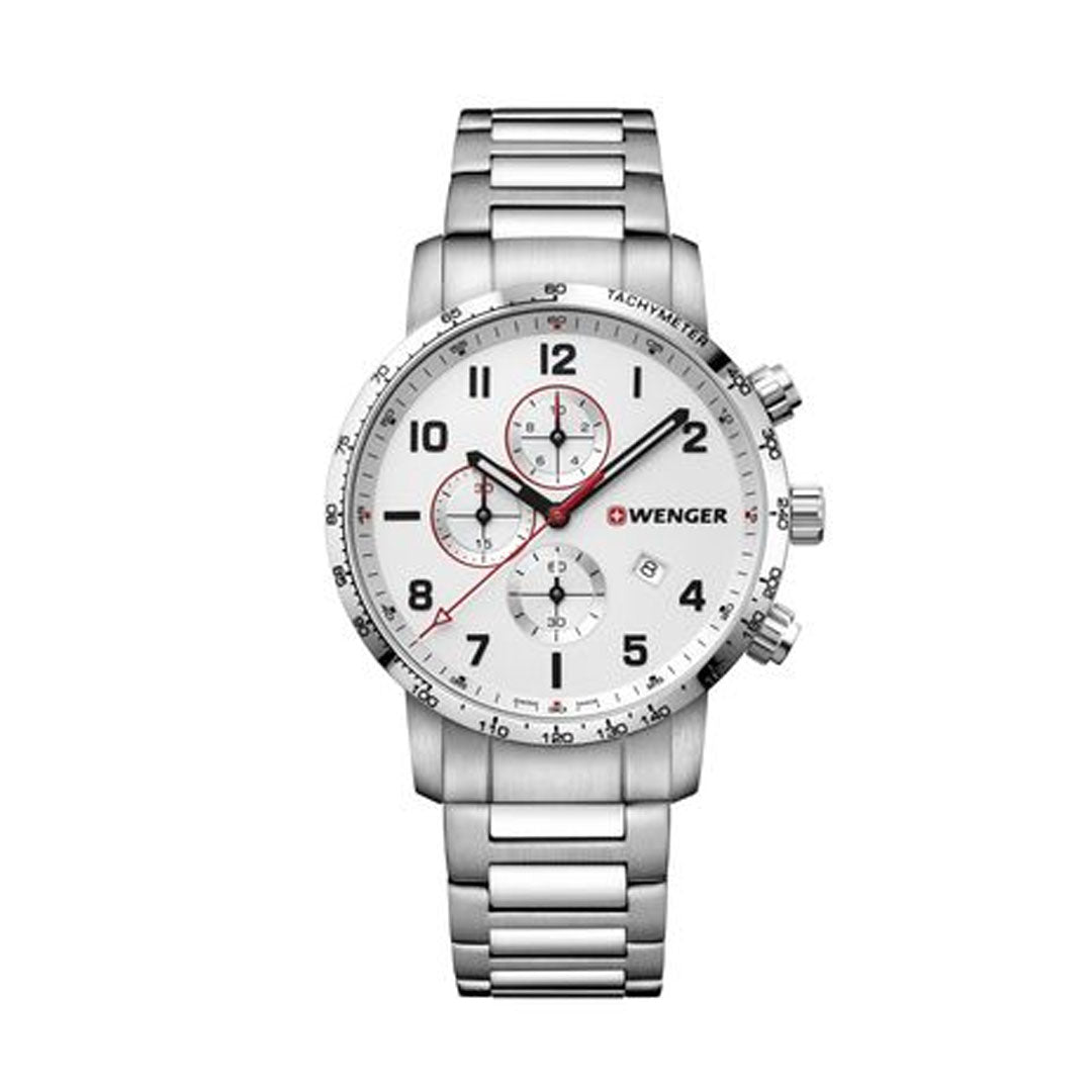 U srcu ovog sata je kvarcni mehanizam (sa baterijom) koji, kao što je uobičajeno za Wenger satove, garantuje precizno mjerenje vremena i pruža sljedeće funkcije: hronograf, datum, minuta, sekunda, sat . Dobra pogodnost za svakodnevnu upotrebu osigurava vodootpornost od 10 ATM. 10 ATM: Sat može podnijeti posjetu bazenu, ali ne i ronjenje."
