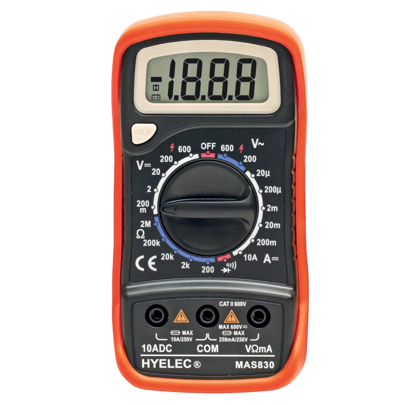 Digitalni mjerni instrument, ručni multimetar ( unimer ), sa display-om, uređaj za mjerenje: istosmjerni napon 200mV / 2V / 20V / 200V / 600V, naizmjenični napon 200V / 600V, istosmjerna struja 20μA / 200μA / 2mA / 200mA / 200mA / 10A, otpor 200ohm, 2 kohm / 20 kohm / 200 kohm / Mohm, ispitivanje diode, ispitivanje prekida. Napajanje 9V DC (6F22). Kategorija mjerenja CAT II 600V