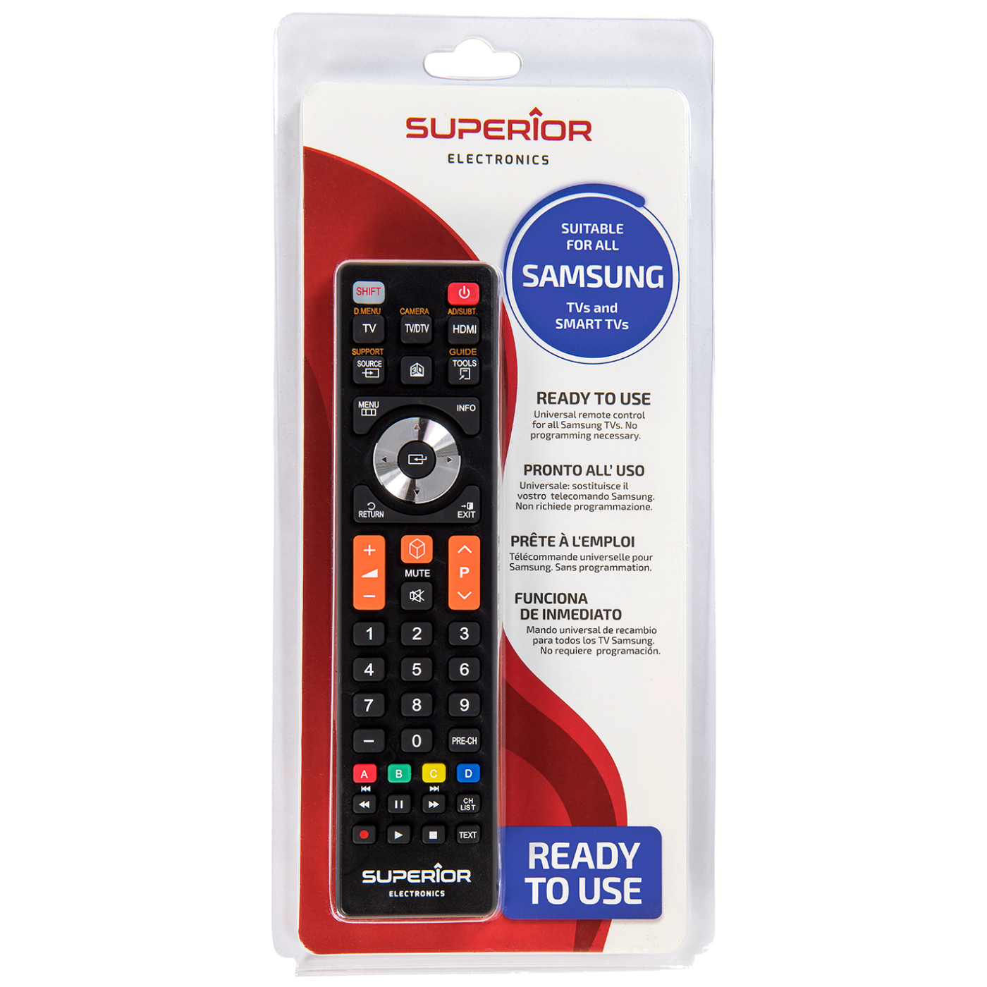 Univerzalni daljinski upravljač sa več predefiniranim kodovima za sve Samsung TV prijemnike ( LCD / PLAZMA / SMART tv ) proizvedene od 2000-te godine, dvostruki IR prijenos čini ovaj daljinski upravljač odmah funkcionalnim. Napajanje baterija AAA x 2.