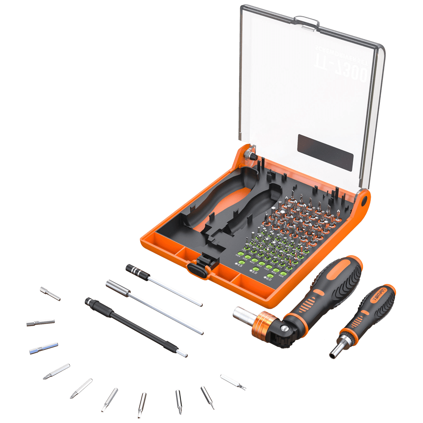 Komplet preciznih alata TT7300 sadrži različite vrste podesivih bitova odvijača za različite vrste vijaka. Odvijač s podesivim kutom do 180 stupnjeva. Dizajniran s neklizajućom teksturiranom ručkom za veću udobnost i sigurnost.
