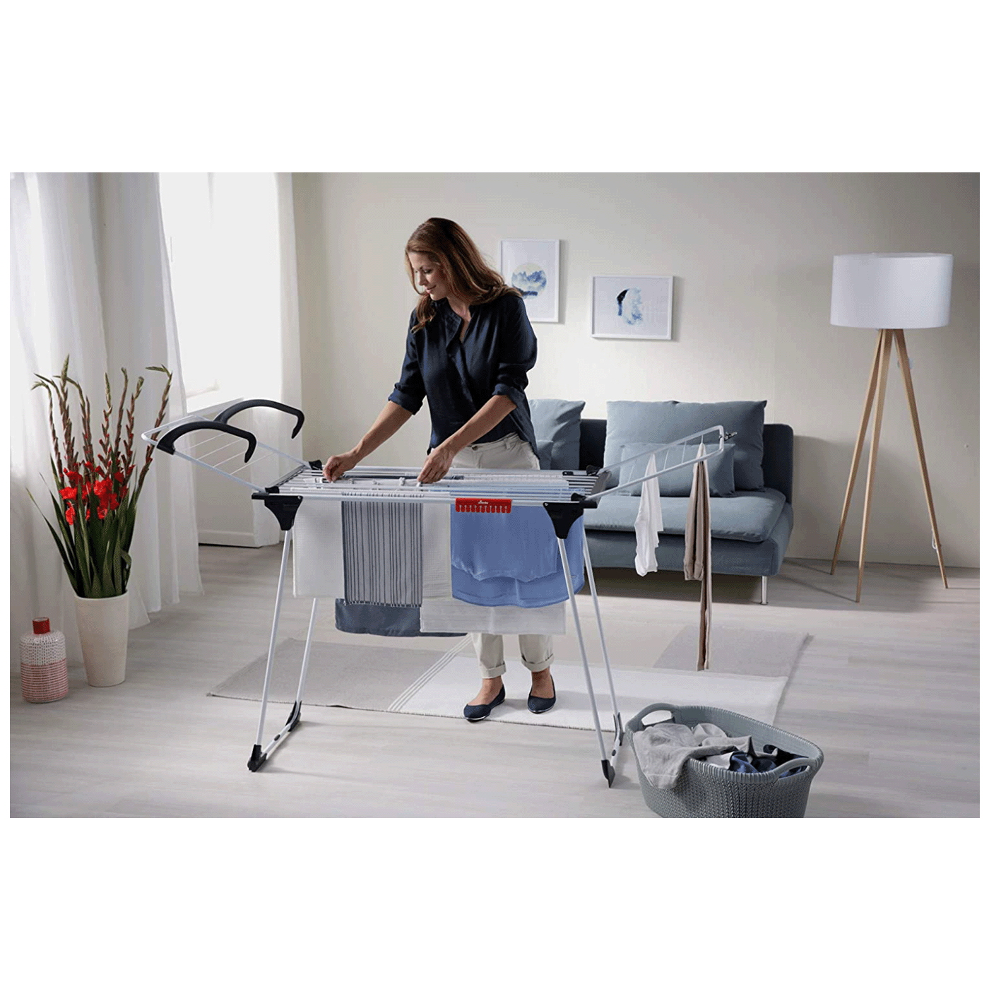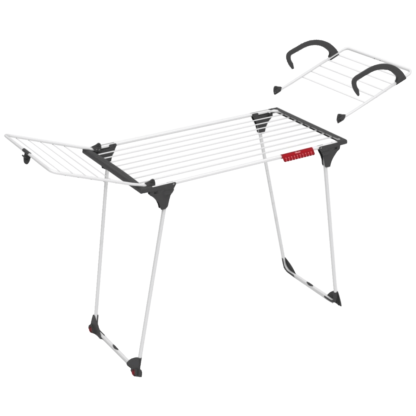 Njena pokretljivost i stabilnost poboljšane su obloženim kotačićima na nogama sušilice. Također ima dodatnu blokadu krila.