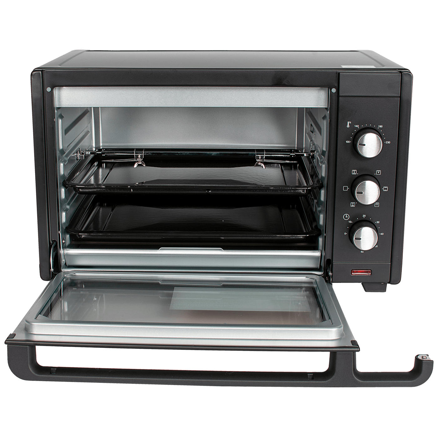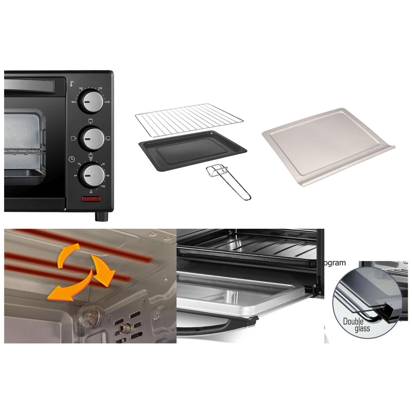 Mini pećnica sa grillom, snaga 2000 W, zapremina 45 lit., podesiva temperatura pečenja 100 - 230 °C, odabir 6 načina rada, 60-minutnim timer, dvostruko ostakljena vrata, unutarnje osvjetljenje, grill, grijač od nehrđajućeg čelika, dimenzije 560 x 420 x 350 mm