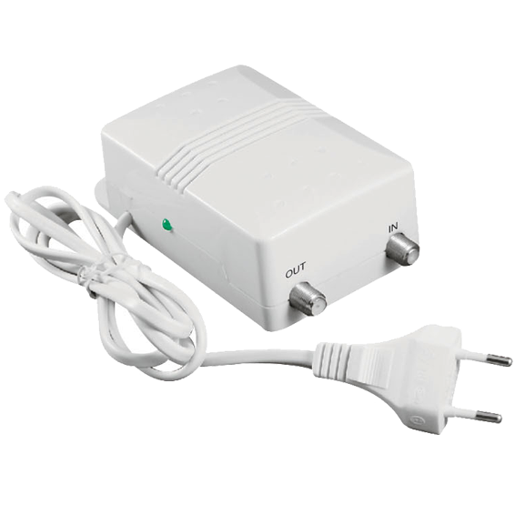 Antensko pojačalo, 1 ulaz (mix VHF+UHF), 1 izlaz (mix VHF+UHF), dobit VHF 24dB, dobit UHF 30dB, podešavanje 0-15dB, frekventni opseg: VHF 47-230MH, UHF 470-860MHz, šum <3.5, priključak In/Out "F-Tip", napajanje 230VAC, indikator, bijela boja.