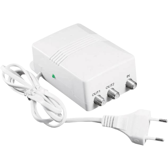 Antensko pojačalo 1ulaz 2 izlaza, ulaz mix VHF/UHF signala, 2 izlaza mix VHF/UHF signala, zasebno pojačanje signala VHF do 20dB, radna frekvencija 47 - 120MHz, UHF pojačanje do 27dB, radna frekvencija 470 - 860MHz. Pojačalo podesivo manualno od 1-15 dB za svaki band što omučuje optimizaciju ravnozeže signala. LED indikacija, IN / OUT konektor - f konektor, napajanje VAC 230V / 10A. Unutarnja montaža, moguče pričvršćenje na zid. Materijal izrede plastika.